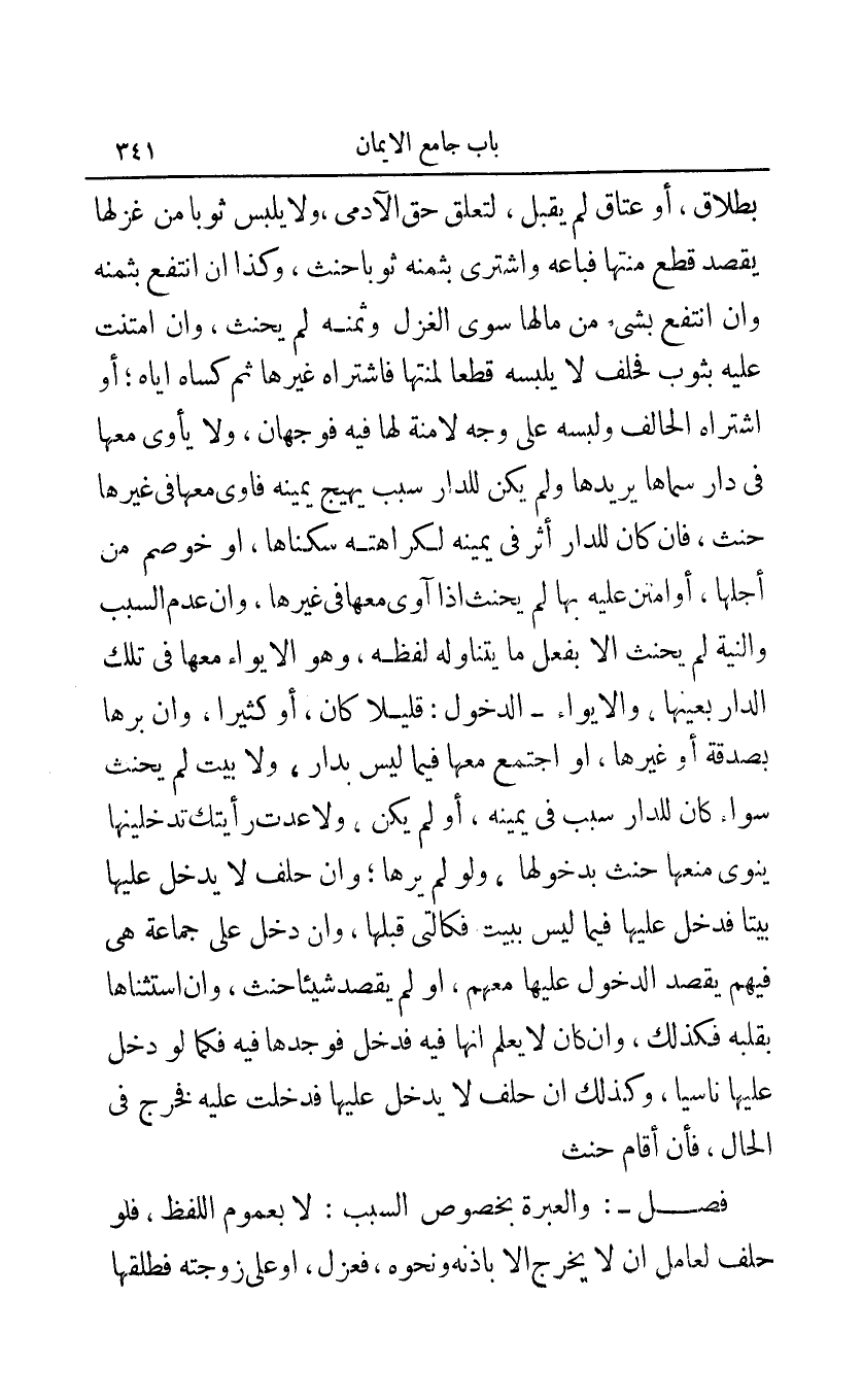 بطلاق أو عتاق لم يقبل لتعلق حق الآدمي ولا يلبس ثوبا من غزلها يقصد قطع منتها فباعه واشترى بثمنه ثوبا حنث وكذا إن انتفع بثمنه وإن انتفع بشيء من مالها سوى الغزل وثمنه لم يحنث وإن امتنت عليه بثوب فحلف لا يلبسه قطعا لمنتها فاشتراه غيرها ثم كساه إياها أو اشتراه الحالف ولبسه على وجه لا منة لها فيه فوجهان ولا يولى معها في دار سماها يريدها ولم يكن للدار سبب يهيج يمينه فأوى معها في غيرها حنث فإن كان للدار أثر في يمينه لكراهته سكناها أو خوصم من أجلها أو امتن عليه بها لم يحنث إذا آوى معها في غيرها وإن عدم السبب والنية لم يحنث إلا بفعل ما يتناوله لفظه وهو الإيواء معها في تلك الدار بعينها والإيواء - الدخول: قليلا كان أو كثيرا وإن برها بصدقة أو غيرها أو اجتمع معها فيما ليس بدار ولا يبيت لم يحنث سواء كان للدار سبب في يمينه أو لم يكن ولا عدت رأيتك تدخلينها ينوي منعها حنث بدخولها ولو لم يرها وإن حلف لا يدخل عليها بيتا فدخل عليها فيما ليس ببيت فكالتي قبلها وإن دخل على جماعة هي فيهم يقصد الدخول عليها معهم أو لم يقصد شيئا حنث وإن استثناها بقلبه فكذلك وإن كان لا يعلم أنها فيه فدخل فوجدها فيه فكما لو دخل عليها ناسيا وكذلك إن حلف لا يدخل عليها فدخلت عليه فخرج في الحال فإن أقام حنث.
