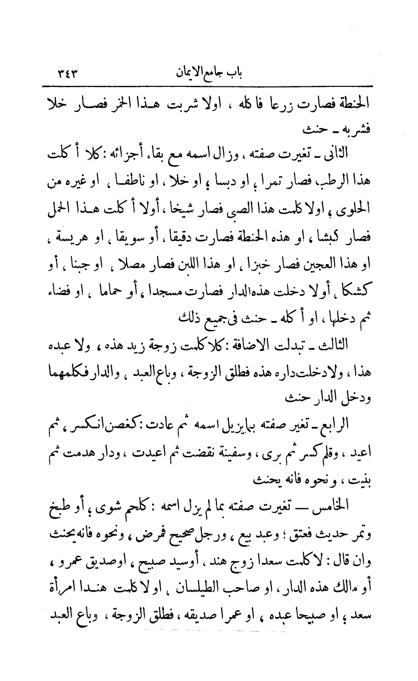 الثاني - تغيرت صفته وزال اسمه مع بقاء أجزائه: كلا أكلت هذا الرطب فصار تمرا أو دبسا أو خلا أو ناطفا أو غيره من الحلوى أو لا كلمت هذا الصبي فصار شيخا أو لا أكلت هذا الحمل فصار كبشا أو هذه الحنطة فصارت دقيقا أو سويقا أو هريسة أو هذا العجين فصار خبزا أو هذا اللبن فصار مصلا أو جبنا أو كشكا أو لا دخلت هذه الدار فصارت مسجدا أو حماما أو فضاء ثم دخلها أو أكله - حنث في جميع ذلك.