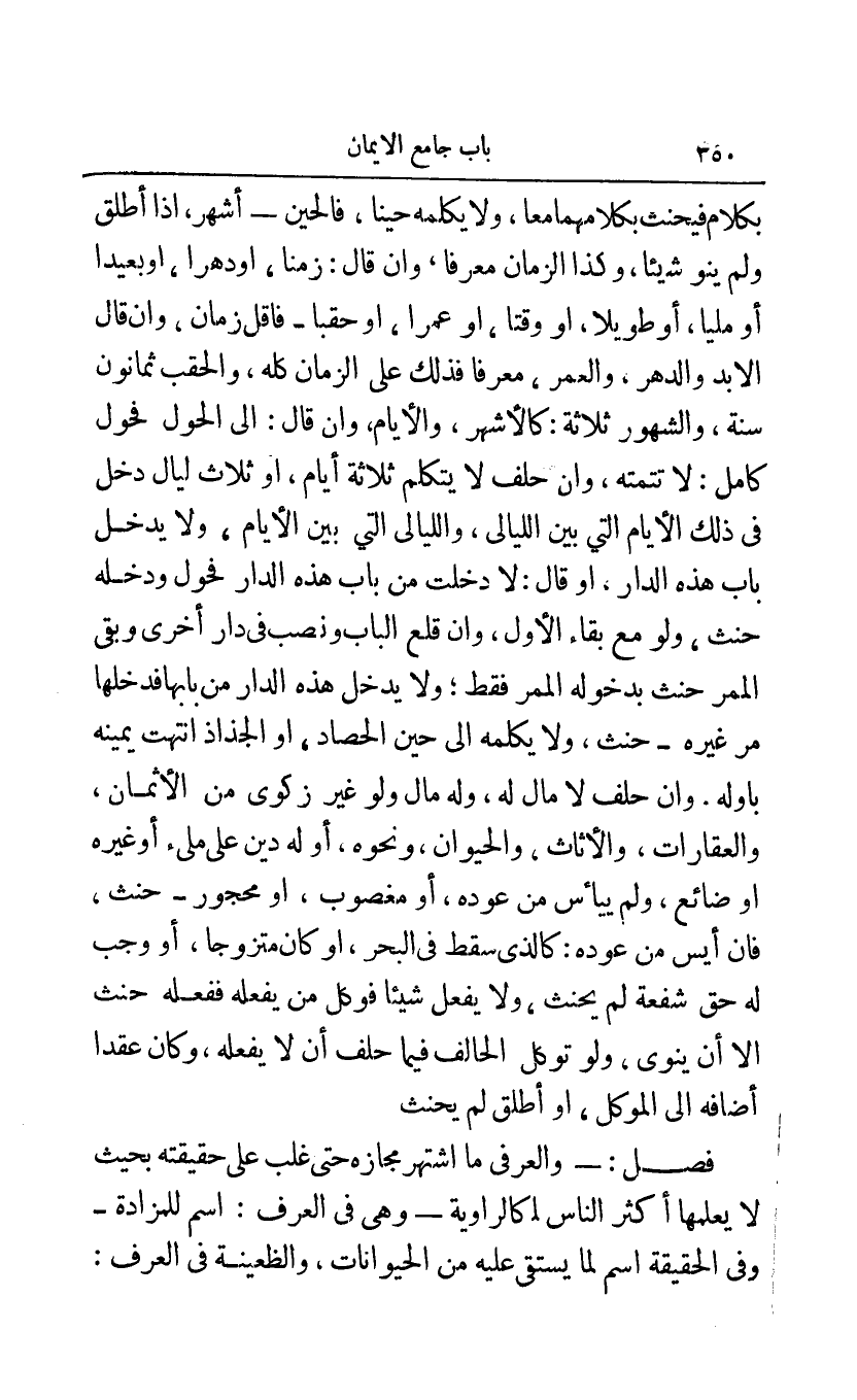 بكلام فيحنث بكلامهما معا ولا يكلمه حينا الحين - أشهر إذا أطلق ولم ينو شيئا وكذا الزمان معرفا وإن قال: زمنا أو دهرا أو بعيدا أو مليا أو طويلا أو وقتا أو حقبا - فأقل زمان وإن قال الأبد والدهر والعمر معرفا فذلك على الزمان كله والحقب ثمانون سنة والشهور ثلاثة: كالأشهر والأيام وإن قال: إلى الحول فحول كامل: لا تتمته وإن حلف لا يتكلم ثلاثة أيام أو ثلاث ليال دخل في ذلك الأيام التي بين الليالي والليالي التي بين الأيام ولا يدخل باب هذه الدار أو قال: لا دخلت من باب هذه الدار فحول ودخله حنث ولو مع بقاء الأول وإن قلع الباب ونصب في دار أخرى وبقي الممر حنث بدخوله الممر فقط ولا يدخل هذه الدار من بابها فدخلها مر غيره - حنث ولا يكلمه إلى حين الحصاد أو الجذاذ انتهت يمينه بأوله وإن حلف لا مال له وله مال ولو غير زكوى من الأثمان والعقارات والأثاث والحيوان ونحوه أو له دين على ملئ أو غيره أو ضائع ولم ييأس من عوده أو مغصوب أو محجور - حنث فإن أيس من عوده: كالذي سقط في البحر أو كان متزوجا أو وجب له حق شفعة لم يحنث ولا يفعل شيئا فوكل من يفعله ففعله حنث إلا أن ينوي ولو توكل الحالف فيما حلف أن لا يفعله وكان عقدا أضافه إلى الموكل أو أطلق لم يحنث.