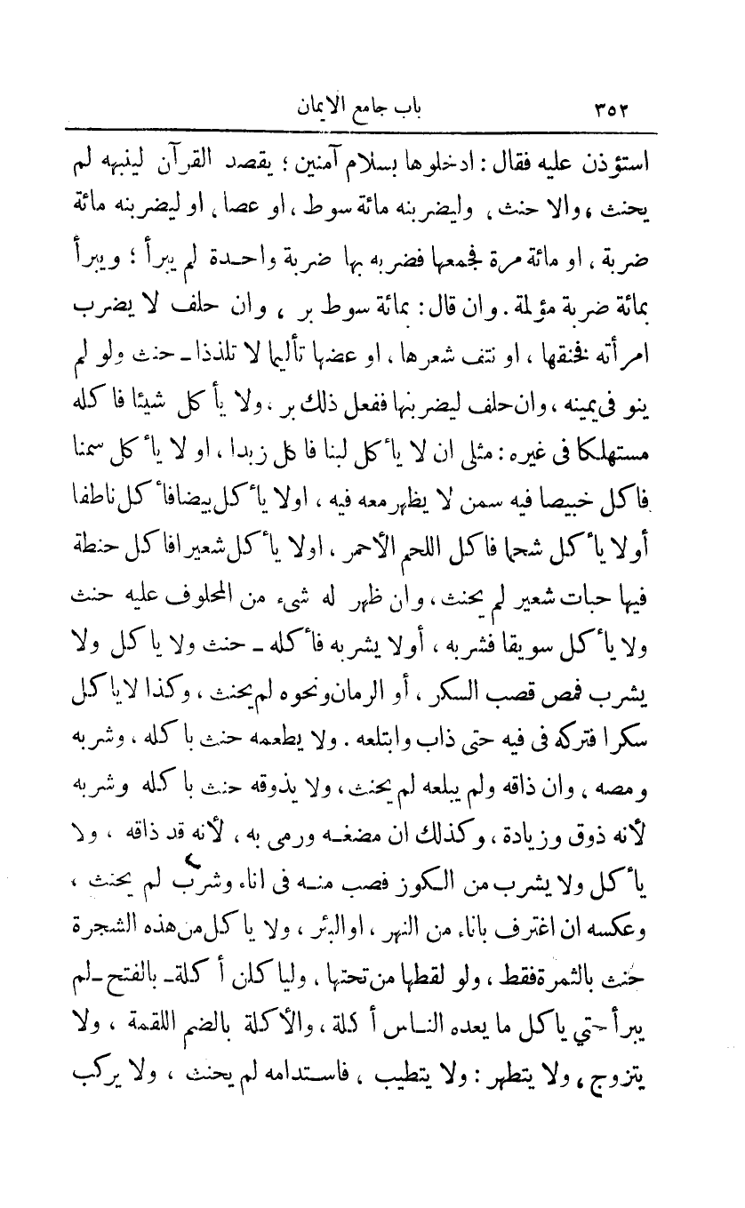 استؤذن عليه فقال: أدخلوها بسلام آمنين يقصد القرآن لينبهه لم يحنث وإلا حنث وليضربنه مائة سوط أو عصا أو ليضربنه مائة ضربة أو مائة مرة فجمعها فضربه بها ضربة واحدة لم يبرأ ويبرأ بمائة ضربة مؤلمة وإن قال: بمائة سوط بر وإن حلف لا يضرب امرأته فخنقها أو نتف شعرها أو عضها تأليما لا تلذذا - حنث ولو لم ينو في يمينه وإن حلف ليضربنها ففعل ذلك بر ولا يأكل شيئا فأكله مستهلكا في غيره: مثل أن لا يأكل لبنا فأكل زبدا أو لا يأكل سمنا فأكل خبيصا فيه سمن لا يظهر معه فيه أو لا يأكل بيضا فأكل ناطفا أو لا يأكل شحما فأكل اللحم الأحمر أو لا يأكل شعيرا فأكل حنطة فيها حبات شعير لم يحنث وإن ظهر له شيء من المحلوف عليه حنث ولا يأكل سويقا فشربه أو لا يشربه فأكله - حنث ولا يأكل ولا يشرب فمص قصب السكر أو الرمان ونحوه لم يحنث وكذا لا يأكل سكرا فتركه في فيه حتى ذاب وابتلعه ولا يطعمه حنث بأكله وشربه ومصه وإن ذاقه ولم يبلعه لم يحنث ولا يذوقه حنث بأكله وشربه لأنه ذوق وزيادة وكذلك إن مضغه ورمى به لأنه قد ذاقه ولا يأكل ولا يشرب من الكوز فصب منه في إناء وشرب لم يحنث عكسه إن اغترف بإناء من النهر أو البئر ولا يأكل من هذه الشجرة حنث بالثمرة فقط ولو لقطها من تحتها وليأكلن أكلة - بالفتح - لم يبرأ حتى يأكل ما يعده الناس أكلة والأكلة بالضم اللقمة ولا يتزوج ولا يتطهر: ولا يتطيب فاستدامه لم يحنث ولا يركب