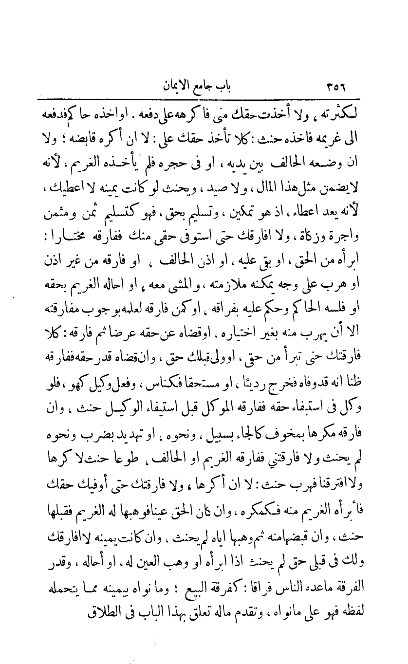 لكثرته ولا أخذت حقك مني فأكرهه على دفعه أو أخذه حاكم فدفعه إلى غريمه فأخذه حنث: كلا تأخذ حقك على: لا أن أكره قابضه ولا أن وضعه الحالف بين يديه أو في حجره فلم يأخذه الغريم لأنه لا يضمن مثل هذا المال ولا صيد يحنث لو كانت يمينه لا أعطيك لأنه يعد إعطاء إذ هو تمكين وتسليم بحق فهو كتسليم ثمن ومثمن وأجرة وزكاة ولا أفارقك حتى أستوفي حقي منك ففارقه مختارا: أبرأه من الحق أو بقي عليه أو أذن الحالف أو فارقه من غير إذن أو هرب على وجه يمكنه ملازمته والمشي معه أو أحاله الغريم بحقه أو فلسه الحاكم وحكم عليه بفراقه أو كمن فارقه لعلمه بوجوب مفارقته إلا أن يهرب منه بغير اختياره أو قضاه عن حقه عرضا ثم فارقه: كلا فارقتك حتى تبرأ من حقي أن ولي قبلك حق وإن قاضه قدر حقه ففارقه ظنا أنه قد وفاه فخرج رديئا أو مستحقا فكناس وفعل وكيل كهو فلو وكل في استيفاء حقه ففارقه الموكل قبل استيفاء الوكيل حنث وإن فارقه مكرها بمخوف كالجاء بسبيل ونحوه أو تهديد بضرب ونحوه لم يحنث ولا فارقتني ففارقه الغريم أو الحالف طوعا حنث لا كرها ولا افترقنا فهرب حنث: لا إن أكرها ولا فارقتك حتى أوفيك حقك فأبرأه الغريم منه فكمكره وإن كان الحق عينا فوهبها له الغريم فقبلها حنث وإن قبضها منه ثم وهبها إياه لم يحنث وإن كانت يمينه لا أفارقك ولك في قبلي حق لم يحنث إذا أبرأه أو وهب العين له أو أحاله وقدر الفرقة ما عده الناس فراقا: كفرقة البيع وما نواه بيمينه مما يتحمله لفظه فهو على ما نواه وتقدم ما له تتعلق بهذا الباب في الطلاق