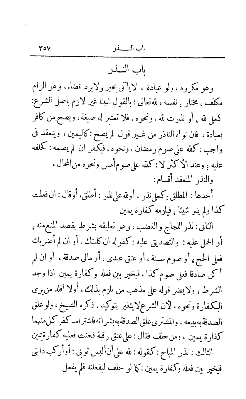 الثالث: نذر المباح: كقوله: لله علي أن ألبس ثوبي أو أركب دابتي فيخير بين فعله وكفارة يمين: كما لو حلف ليفعلنه فلم يفعل