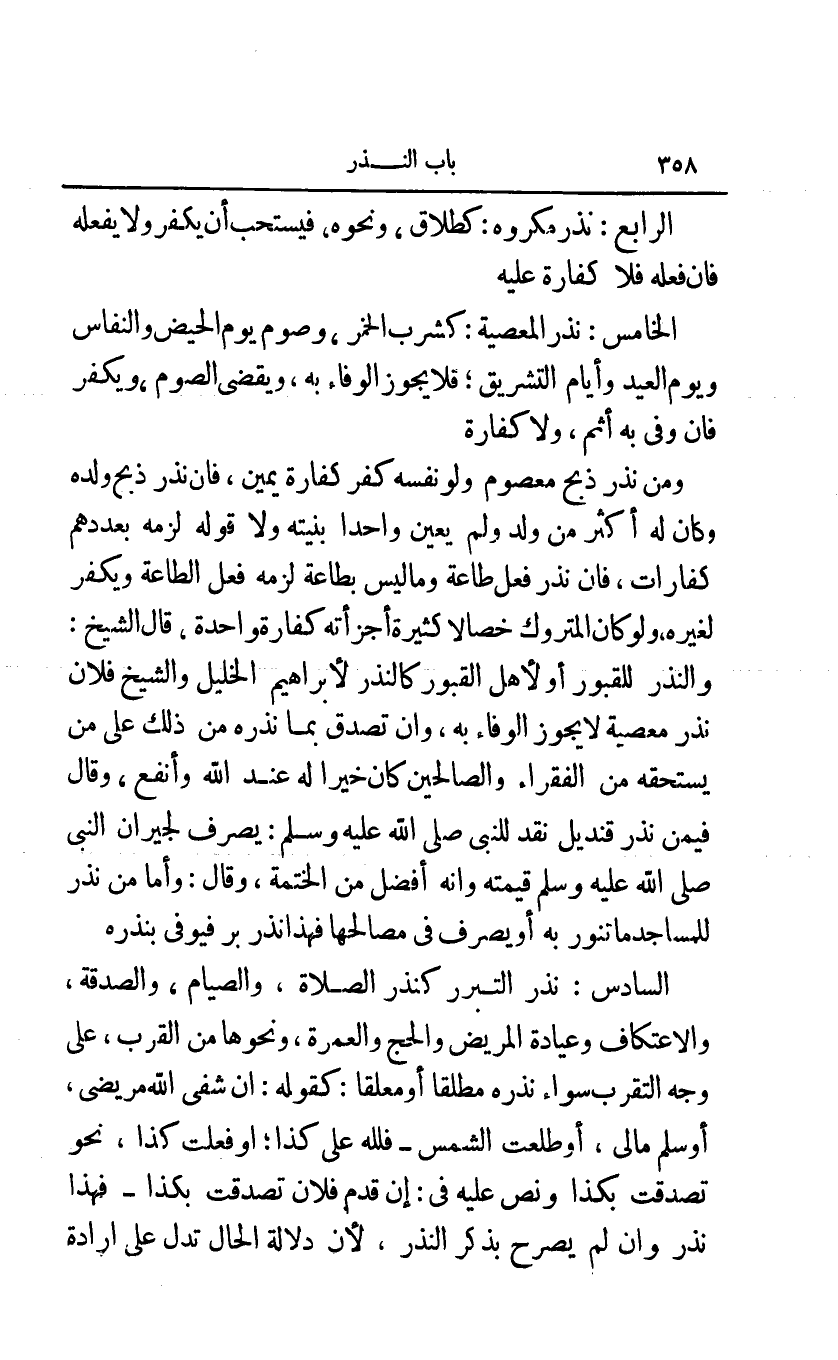 السادس: نذر التبرر كنذر الصلاة والصيام والصدقة والاعتكاف وعيادة المريض والحج والعمرة ونحوها من القرب على وجه التقرب سواء نذره مطلقا أو معلقا: كقوله: إن شفى الله مريضي أو سلم مالي أو طلعت الشمس - فلله علي كذا أو فعلت كذا نحو تصدقت بكذا ونص عليه في: إن قدم فلان تصدقت بكذا - فهذا نذر وإن لم يصرح بذكر النذر لأن دلالة الحال تدل على إرادة