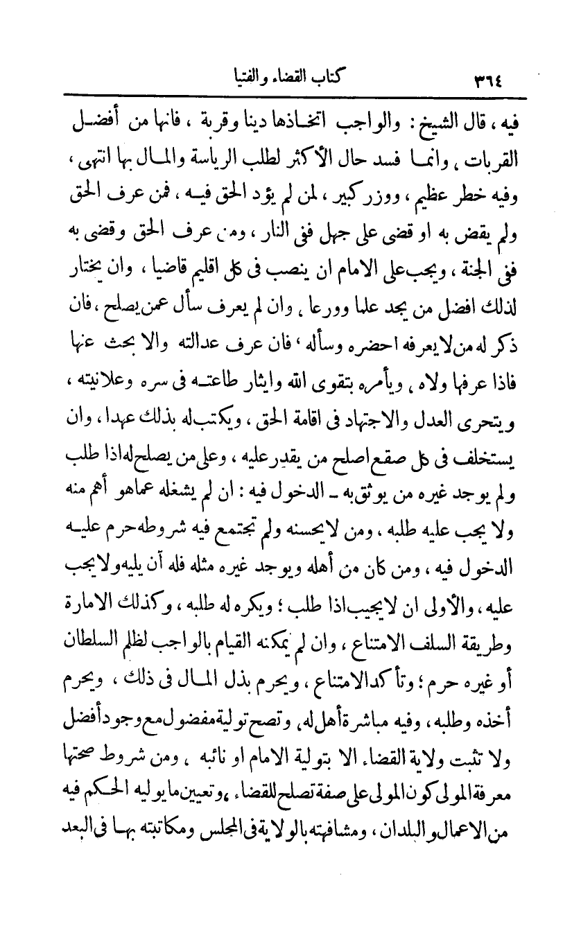 فيه قال الشيخ: والواجب اتخاذها دينا وقربة فإنها من أفضل القربات وإنما فسد حال الأكثر لطلب الرياسة والمال بها انتهى وفيه خطر عظيم ووزر كبير لمن لم يؤد الحق فيه فمن عرف الحق ولم يقض به أو قضى على جهل ففي النار ومن عرف الحق وقضى به ففي الجنة ويجب على الإمام أن ينصب في كل أقليم قاضيا وأن يختار لذلك أفضل من يجد علما وورعا وإن لم يعرف سأل عمن يصلح فإن ذكره له من لا يعرفه أحضره وسأله فإن عرف عدالته وإلا بحث عنها فإذا عرفها ولاه ويأمره بتقوى الله وإيثار طاعته في سره وعلانيته ويتحرى العدل والاجتهاد في إقامة الحق ويكتب له بذلك عهدا وأن يستخلف في كل صقع أصلح من يقدر عليه وعلى من يصلح له إذا طلب ولم يوجد غيره من يوثق به - الدخول فيه: إن لم يشغله عما هو أهم منه ولا يجب عليه طلبه ومن لا يحسنه ولم تجتمع فيه شروطه حرم عليه الدخول فيه ومن كان من أهله ويوجد غيره مثله فله أن يليه ولا يجب عليه والأولى أن لا يجيب إذا طلب ويكره له طلبه وكذلك الإمارة وطريقة السلف الامتناع وإن لم يمكنه القيام بالواجب لظلم السلطان أو غيره حرم وتأكد الامتناع ويحرم بذل المال في ذلك ويحرم أخذه وطلبه وفيه مباشرة أهل له وتصح تولية مفضول مع وجود أفضل ولا تثبت ولاية القضاء إلا بتولية الإمام أو نائبه ومن شروط صحتها معرفة المولى كون المولى على صفة تصلح للقضاء وتعيين ما يوليه الحكم فيه من الأعمال والبلدان ومشافهته بالولاية في المجلس ومكاتبته بها في البعد
