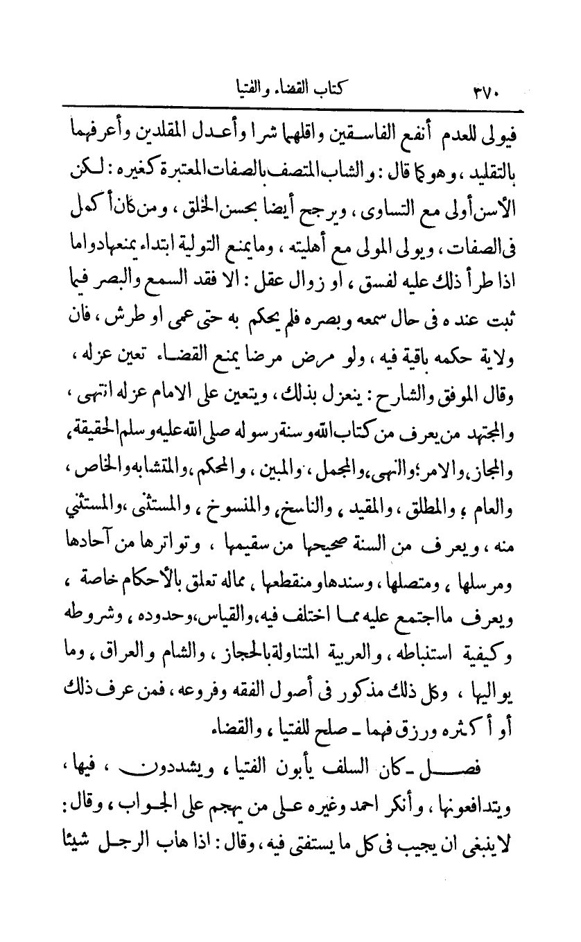 فيولى للعدم أنفع الفاسقين وأقلهما شرا وأعدل المقلدين وأعرفهما بالتقليد وهو كما قال: والشاب المتصف بالصفات المعتبرة كغيره: لكن الأسن أولى مع التساوي ويرجح أيضا بحسن الخلق ومن كان أكمل في الصفات ويولي المولى مع أهليته وما يمنع التولية ابتداء يمنعها دواما إذا طرأ ذلك عليه لفسق أو زوال عقل: إلا فقد السمع والبصر فيا ثبت عنده في حال سمعه وبصره فلم يحكم به حتى عمى أو طرش فإن ولاية حكمه باقية فيه ولو مرض مرضا يمنع القضاء تعين عزله وقال الموفق والشارح: ينعزل بذلك ويتعين على الإمام عزله انتهى والمجتهد من يعرف من كتاب الله وسنة رسوله صلى الله عليه وسلم الحقيقة، والمجاز والأمر والنهي والمجمل والمبين والمحكم والمتشابه والخاص والعام والمطلق والمقيد والناسخ والمنسوخ والمستثنى والمستثنى منه ويعرف من السنة صحيحها من سقيمها وتواترها من آحادها ومرسلها ومتصلها وسندها ومنقطعها مما له تعلق بالأحكام خاصة ويعرف ما اجتمع عليه مما اختلف فيه والقياس وحدوده وشروطه وكيفية استنباطه والعربية المتناولة بالحجاز والشام والعراق وما يواليها وكل ذلك مذكور في أصول الفقه وفروعه فمن عرف ذلك أو أكثره ورزق فهما - صلح للفتيا والقضاء.