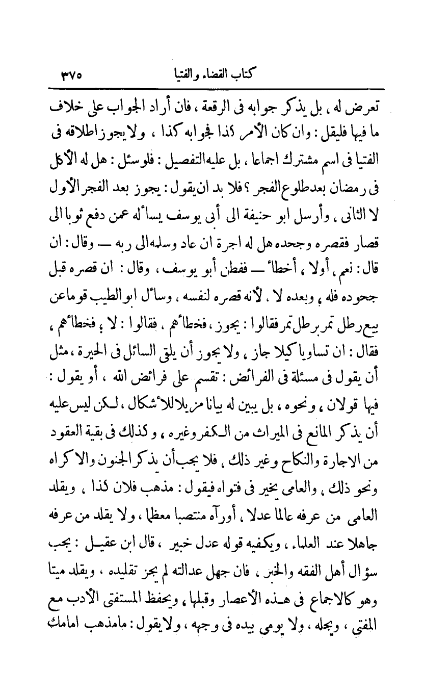 تعرض له بل يذكر جوابه في الرقعة فإن أراد الجواب على خلاف ما فيها فليقل: وإن كان الأمر كذا فجوابه كذا ولا يجوز إطلاقه في الفتيا في اسم مشترك إجماعا بل عليه التفصيل: فلو سئل: هل له الأكل في رمضان بعد طلوع الفجر؟ فلا بد أن يقول: يجوز بعد الفجر الأول لا الثاني وأرسل أبو حنيفة إلى أبي يوسف يسأله عمن دفع ثوبا إلى قصار فقصره وجحده هل له أجرة إن عاد وسلمه إلى ربه - وقال: إن قال: نعم أو لا أخطأ - ففطن أبو يوسف وقال: إن قصره قبل جحوده فله وبعده لا لأنه قصره لنفسه وسأل أبو الطيب قوما عن بيع رطل تمر برطل تمر فقالوا: يجوز فخطأهم فقالوا: لا فخطأهم فقال: إن تساويا كيلا جاز ولا يجوز أن يلقي السائل في الحيرة مثل أن يقول في مسئلة في الفرائض: تقسم على فرائض الله أو يقول: فيها قولان ونحوه بل يبين له بيانا مزيلا للإشكال لكن ليس عليه أن يذكر المانع في الميراث من الكفر وغيره وكذلك في بقية العقود من الإجارة والنكاح وغير ذلك فلا يجب أن يذكر الجنون والإكراه ونحو ذلك والعامي يخير في فتواه فيقول: مذهب فلان كذا ويقلد العامي من عرفه عالما عدلا أو رآه منتصبا معظما ولا يقلد من عرفه جاهلا عند العلماء ويكفيه قوله عدل خبير قال ابن عقيل: يجب سؤال أهل الفقه والخبر فإن جهل عدالته لم يجز تقليده ويقلد ميتا وهو كالإجماع في هذه الأعصار وقبلها ويحفظ المستفتى الأدب مع المفتي ويجله ولا يومي بيده في وجهه ولا يقول: ما مذهب إمامك
