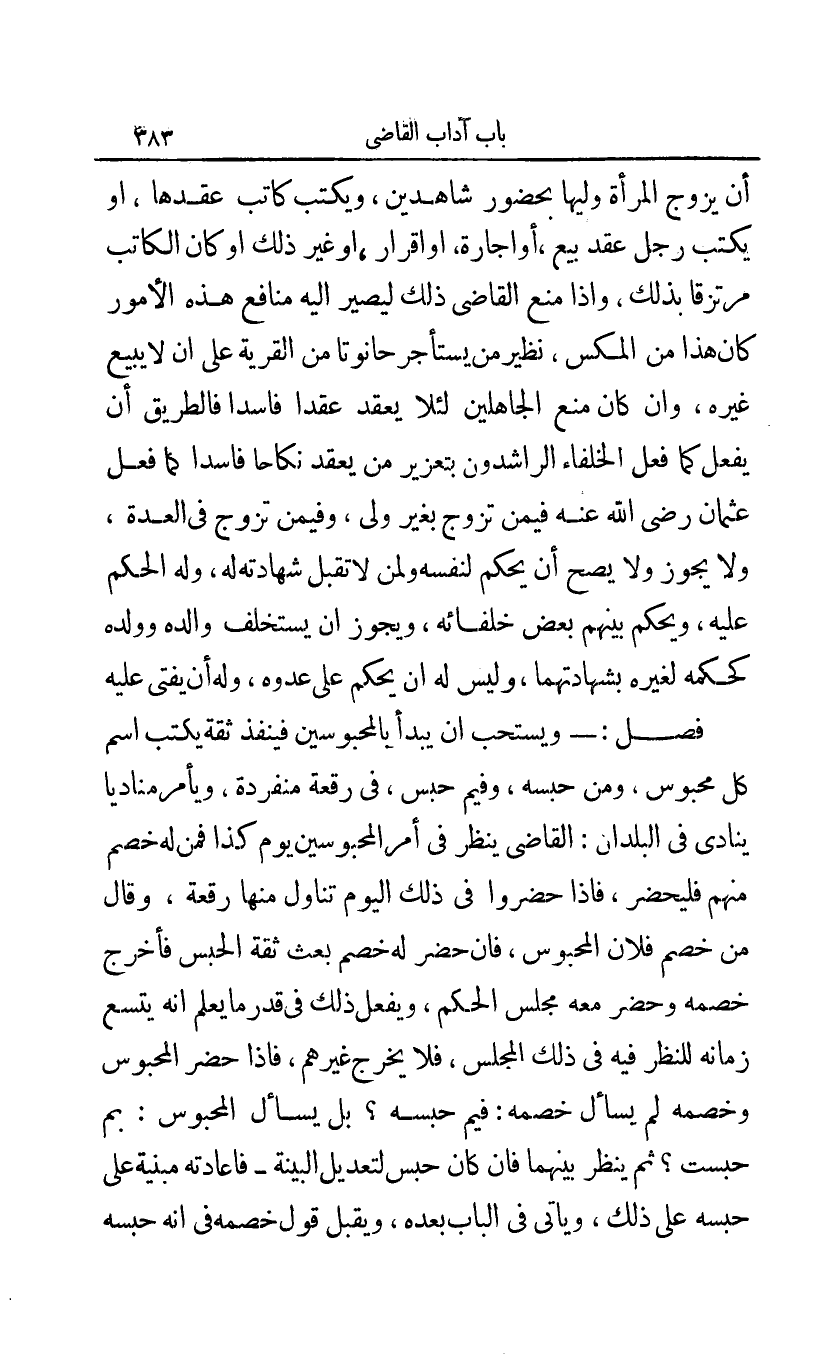 أن يزوج المرأة وليها بحضور شاهدين ويكتب كاتب عقدها أو يكتب رجل عقد بيع أو إجارة أو إقرار أو غير ذلك أو كان الكاتب مرتزقا بذلك وإذا منع القاضي ذلك ليصير إليه منافع هذه الأمور كان هذا من المكس نظير من يستأجر حانوتا من القرية على أن لا يبيع غيره وإن كان منع الجاهلين لئلا يعقد عقدا فاسدا فالطريق أن يفعل كما فعل الخلفاء الراشدون بتعزير من يعقد نكاحا فاسدا كما فعل عثمان رضي الله عنه فيمن تموج بغير ولي وفيمن تزوج في العدة ولا يجوز ولا يصح أن يحكم لنفسه ولمن لا تقبل شهادته له له الحكم عليه ويحكم بينهم بعض خلفائه ويجوز أن يستخلف والده وولده كحكمه لغيره بشهادتهما ليس له أن يحكم على عدوه وله أن يفتي عليه.