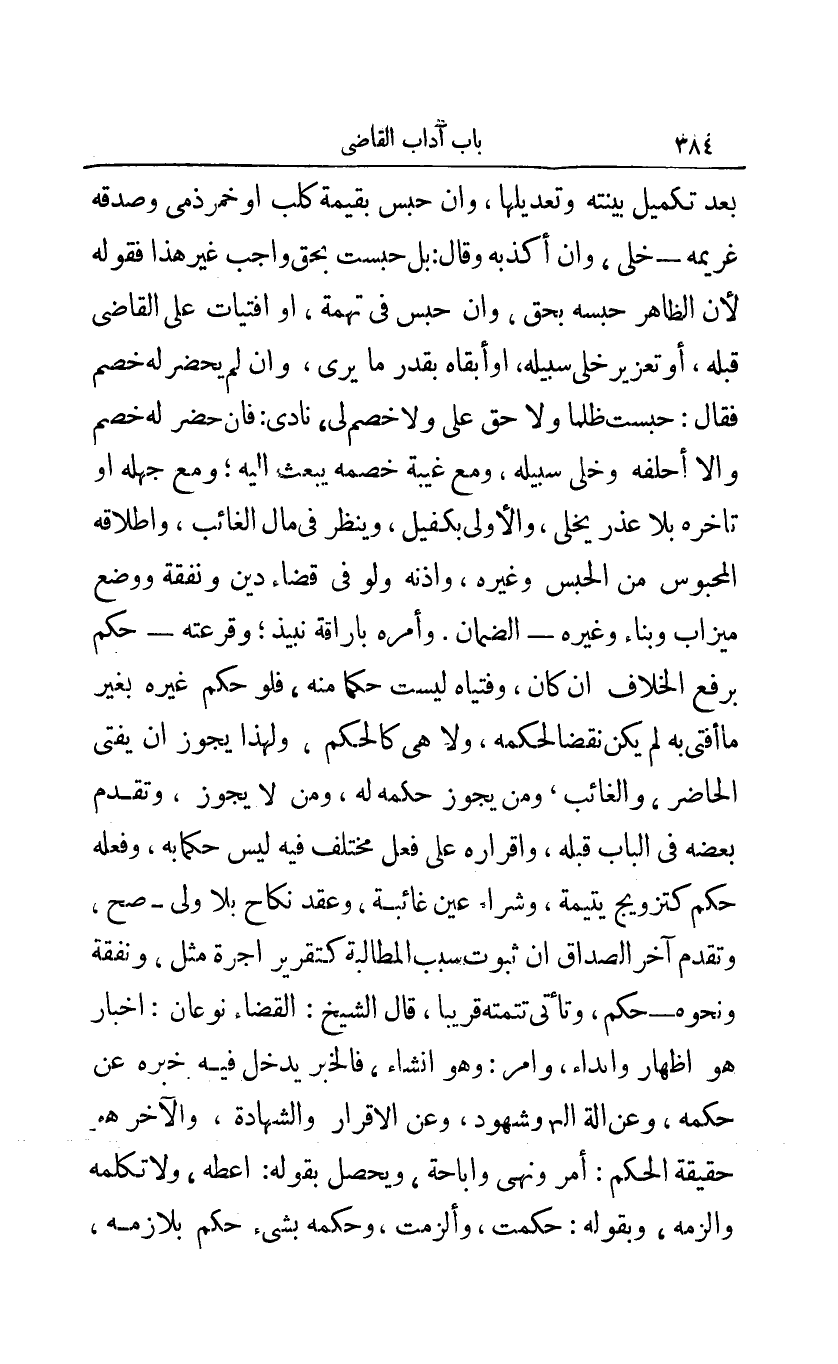 بعد تكميل بينته وتعديلها وإن حبس بقيمة كلب أو خمر ذمي وصدقه غريمه - خلي وإن أكذبه وقال: بل حبست بحق واجب غير هذا فقوله لأن الظاهر حبسه بحق وإن حبس في تهمة أو الفتيات على القاضي قبله وتعزير خلي سبيله أو أبقاه بقدر ما يرى وإن لم يحضر له خصم فقال: حبست ظلما ولا حق علي ولا خصم لي نادى: فإن حضر له خصم وإلا أحلفه وخلي سبيله ومع غيبة خصمه يبعث إليه ومع جهله أو تأخره بلا عذر يخلي والأولى بكفيل وينظر في مال الغائب وإطلاقه المحبوس من الحبس وغيره وإذنه ولو في قضاء دين ونفقة ووضع ميزا وبناء وغيره - الضمان وأمره بإراقة نبيذ وقرعته - حكم برفع الخلاف إن كن وفتياه ليست حكما منه فلو حكم غيره بغير ما أفتى به لم يكن نقضا لحكمه ولا هي كالحكم ولهذا يجوز أن يفتي الحاضر والغائب ومن يجوز حكمه له ومن لا يجوز وتقدم بعضه في الباب قبله وإقراره على فعل مختلف فيه ليس حكما به وفعله حكم كتزويج يتيمة وشراء عين غائبة وعقد نكاح بلا ولي - صح وتقدم آخر الصداق أن ثبوت سبب المطالبة كتقرير أجرة مثل ونفقة ونحوه - حكم وتأتي تتمته قريبا قال الشيخ: القضاء نوعان: إخبار هو إظهار وإبداء وأمر: وهو إنشاء فالخبر يدخل فيه خبره عن حكمه وعن آلة ال وشهود وعن الإقرار والشهادة والآخر هو حقيقة الحكم: أمر ونهي وإباحة ويحصل بقوله: أعطه ولا تكلمه والزمه وبقوله: حكمت وألزمت وحكمه بشيء حكم يلازمه،
