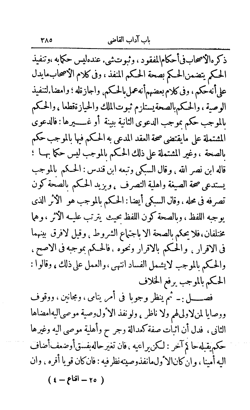 ذكره الأصحاب في أحكام المفقود وثبوت شيء عنده ليس حكما به وتنفيذ الحكم يتضمن الحكم بصحة الحكم المنفذ وفي كلام الأصحاب ما يدل على أنه حكم وفي كلام بعضهم أنه عمل بالحكم وأجازه له وإمضاء لتنفيذ الوصية والحكم بالصحة يستلزم ثبوت الملك والحيازة قطعا والحكم بالموجب حم بموجب الدعوى الثانية ببينة أو غيرها: فالدعوى المشتملة على ما يقتضي صحة العقد المدعى به الحك فيها بالموجب حكم بالصحة وغير المشتملة على ذلك الحكم بالموجب ليس حكما بها قاله ابن نصر الله وقال السبكي وتبعه ابن قندس: الحكم بالموجب يستدعى صحة الصيغة وأهلية التصرف ويزيد الحكم بالصحة كون تصرفه في محله وقال السبكي أيضا: الحكم بالموجب هو الأثر الذي يوجبه اللفظ وبالصحة كون اللفظ بحيث يترتب عليه الأثر وهما مختلفان فلا يحكم بالصحة إلا باجتماع الشروط وقيل لا فرق بينهما في الإقرار ونحوه فالحكم بموجبه في الأصح والحكم بالموجب لا يشمل الفساد انتهى والعمل على ذلك وقالوا: الحكم بالموجب يرفع الخلاف.