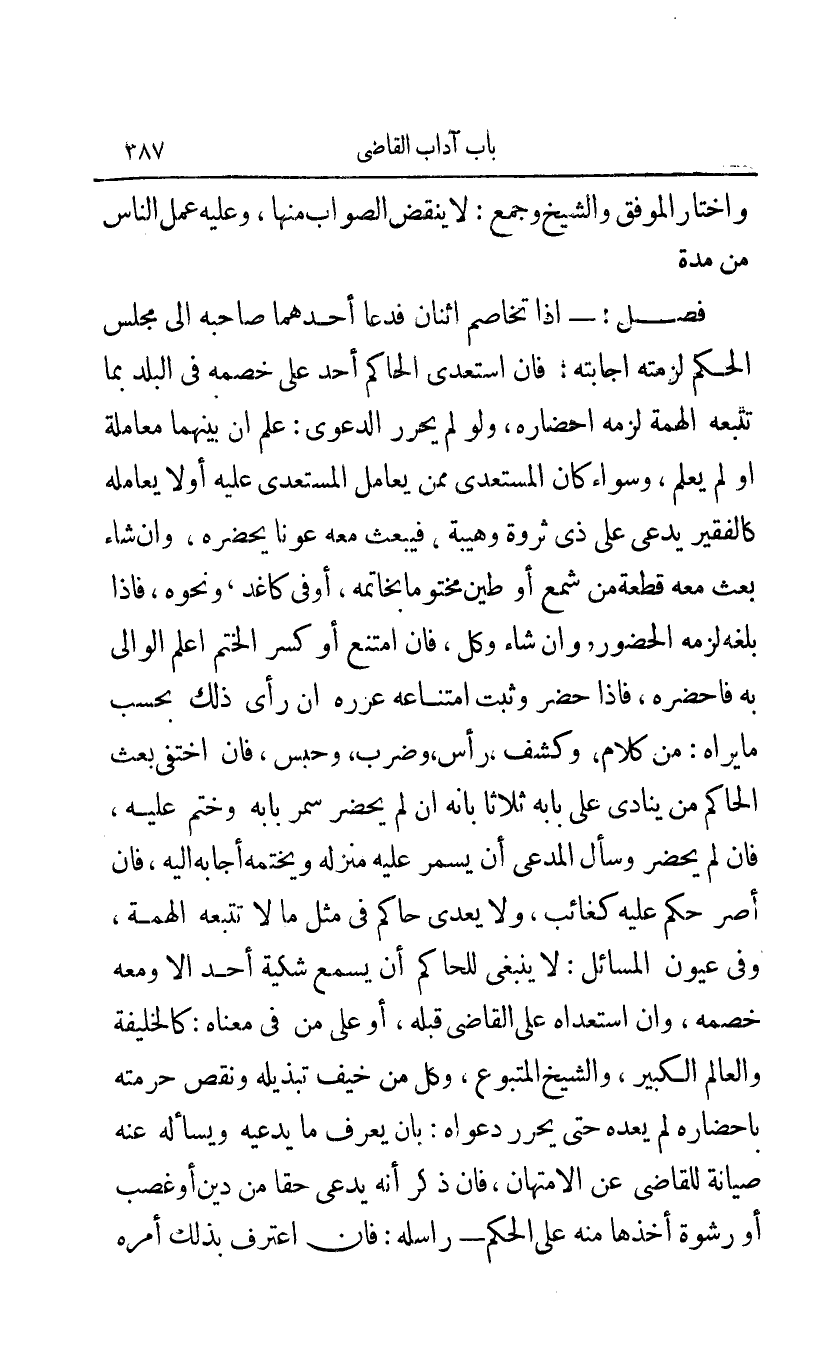 فإن استدعى الحاكم أحد على خصمه في البلد بما تتبعه الهمة لزمه إحضاره ولو لم يحرر الدعوى: علم أن بينهما معاملة أو لم يعلم وسواء كان المستعدى ممن يعامل المستعدي عليه أولا يعامله كالفقير يدعى على ذي ثروة وهيبة فيبعث معه عونا يحضره وإن شاء بعث معه قطعة من شمع أو طين مختوما بخاتمه أو في كاغد ونحوه فإذا بلغه لزمه لحضور وإن شاء وكل فإن امتنع أو كسر الختم أعلم الوالي به فأحضره فإذا حضر وثبت امتناعه عزره إن رأى ذلك بحسب ما يراه: من كلام وكشف رأس وضرب وحبس فإن اختفى بعث الحاكم من ينادي على بابه ثلاثا بأنه إن لم يحضر سمر بابه وختم عليه فإن لم يحضر وسأل المدعي أن يسمر عليه منزله ويختمه أجابه إليه فإن أصر حكم عليه كغائب ولا يعدي حاكم في مثل ما لا تتبعه الهمة وفي عيون المسائل لا ينبغي للحاكم أن يسمع شكية أحد إلا ومعه خصمه وإن استدعاه على القاضي قبل أو على من ففي معناه: كالخليفة والعالم الكبير والشيخ المتبوع وكل من خيف تبذيله ونقص حرمته بإحضاره لم يعده حتى يحرر دعواه: بأن يعرف ما يدعيه ويسأله عنه صيانة للقاضي عن الامتهان فإن ذكر أنه يدعى حقا من دين أو غصب أو رشوة أخذها منه على الحكم - راسله: فإن اعترف بذلك أمره