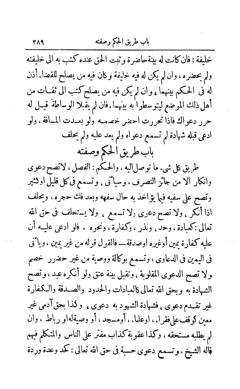 طريق كل شيء ما توصل إليه والحكم: الفصل لا تصح دعوى وإنكار إلا من جائز التصرف وسيأتي وتسمع في كل قليل أو كثير وصح على سفيه فما يؤاخذ به حال سفهه وبعد فك حجره ويحلف إذا أنكر ولا تصح دعوى ولا تسمع ولا يستحلف في حق الله تعالى: كعبادة وحد ونذر وكفارة ونحوه فلو ادعى عليه أن عليه كفارة يمين أو غيره أو صدقة - فالقول قوله من غير يمين ويأتي في اليمين في الدعاوى وتسمع بوكالة ووصية من غير حضور خصم ولا تصح الدعوى المقلوبة وتقبل بينة عتق ولو أنكره عبد وتصح الشهادة به وبحق الله تعالى كالعبادات والحدود والصدقة والكفارة غير تقدم دعوى فشهادة الشهود به دعوى وكذا بحق آدمي غير معين كوقف على فقراء أو علماء أو مسجد أو وصية له أو رباط وإن لم يطلبه مستحقه وكذا عقوبة كذاب مفتر على الناس والمتكلم فيهم قاله الشيخ وتسمع دعوى حسبة في حق الله تعالى: كحد وعدة وردة