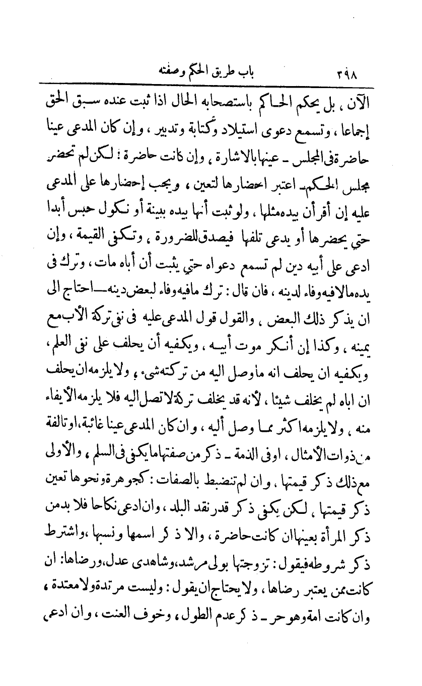 الآن، بل يحكم الحاكم باستصحابه الحال إذا ثبت عنده سبق الحق إجماعا وتسمع دعوى استيلاد وكتابة وتدبير وإن كان المدعي عنيا حاضرة في المجلس - عينها بالإشارة وإن كانت حاضرة: لكن لم تحضر مجلس الحكم - اعتبر إحضارها لتعين ويجب إحضارها على المدعى عليه إن أقر أن بيده مثلها ولو ثبت أنها بيده ببينة أو نكول حبس أبدا حتى يحضرها أو يدعي تلفها فيصدق للضرورة وتكفي القيمة وإن ادعى على أبيه دين لم تسمع دعواه حتى يثبت أن أباه مات وترك في يده مالا فيه وفاء لدينه فإن قال: ترك ما فيه وفاء لبعض دينه - احتاج إلى أن يذكر ذلك البعض والقول قول المدعى عليه في نفي تركة الأب مع يمينه وكذا إن أنكر موت أبيه ويكفيه أن يحلف على نفي العلم ويكفيه أن يحلف أنه ما وصل إليه من تكرته شيء ولا يلزمه أن يحلف أن أباه لم يخلف شيئا لأنه قد يخلف تركة لا تصل إليه فلا يلزمه الإيفاء منه ولا يلزمه أكثر مما وصل إليه وإن كان المدعي عينا غائبة أو تالفة من ذوات الأمثال أو في الذمة - ذكر من صفتها ما يكفي في المسلم والأولى مع ذلك ذكر قيمتها وإن لم تنضبط بالصفات: كجوهرة ونحوها تعين ذكر قيمتها لكن يكفي ذكر قدر نقد البلد وإن ادعى نكاحا فلا بد من ذكر المرأة بعينها إن كانت حاضرة وإلا ذكر اسمها ونسبها واشترط ذكر شروطه فيقول: تزوجتها بولي مرشد وشاهدي عدل ورضاها: إن كانت ممن يعتبر رضاها ولا يحتاج أن يقول: وليست مرتدة ولا معتدة وإن كانت أمة وهو حر - ذكر عدم الطول وخوف العنت وإن ادعى