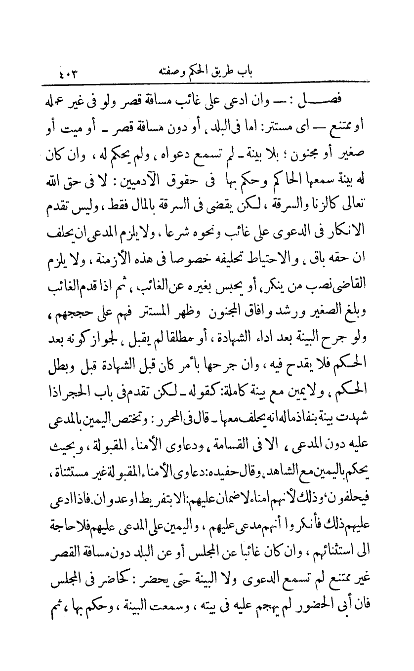 ولو في غير عمله أو ممتنع - أي مستتر: إما في البلد أو دون مسافة قصر - أو ميت أو صغير أو مجنون بلا بينة - لم تسمع دعواه ولم يحكم له وإن كان له بينة سمعها الحاكم وحكم بها في حقوق الآدميين: لا في حق الله تعالى كالزنا والسرقة لكن يقضي في السرقة بالمال فقط وليس تقدم الإنكار في الدعوى على غائب ونحوه شرعا ولا يلزم المدعي أن يحلف أن حقه باق والاحتياط تحليفه خصوصا في هذه الأزمنة ولا يلزم القاضي نصب من ينكر أو يحبس بغيره عن الغائب ثم إذا قدم الغائب وبلغ الصغير ورشد وأفاق المجنون وظهر المستتر فهم على حججهم ولو جرح البينة بعد أداء الشهادة أو مطلقا لم يقبل لجواز كونه بعد الحكم فلا يقدح فيه وإن جرحها بأمر كان قبل الشهادة قبل وبطل الحكم ولا يمين مع بينة كاملة: كقوله - لكن تقدم في باب الحجر إذا شهدت بينة بنفاذ ماله أنه يحلف معها - قال في المحرر: وتختص اليمين بالمدعى عليه دون المدعي إلا في القسامة ودعاوى الأمناء المقبولة وبحيث يحكم باليمين مع الشاهد وقال حفيده: دعاوى الأمناء مستثناه فيحلفون وذلك لأنهم أمناء لا ضمان عليهم: إلا بتفريط أو عدوان فإذا ادعى عليهم ذلك فأنكروا أنهم مدعى عليهم واليمين على المدعى عليهم فلا حاجة إلى استثنائهم وإن كان غائبا عن المجلس أو عن البلد دون مسافة القصر غير ممتنع لم تسمع الدعوى ولا البينة حتى يحضر: كحاضر في المجلس فإن أبى الحضور لم يهجم عليه في بيته وسمعت البينة وحكم بها، ثم