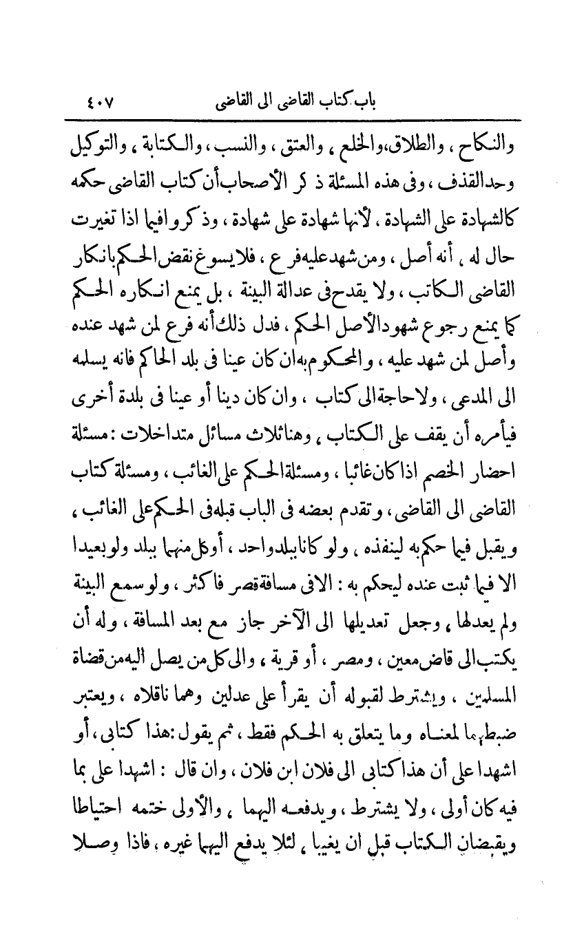والنكاح، والطلاق والخلع والعتق والنسب والكتابة والتوكيل وحد القذف وفي هذه المسئلة ذكر الأصحاب أن كتاب القاضي حكمه كالشهادة على الشهادة لأنها شهادة على شهادة وذكروا فيما إذا تغيرت حال له أنه أصل ومن شهد عليه فرع فلا يسوغ نقض الحكم بإنكار القاضي الكاتب ولا يقدح في عدالة البينة بل يمنع إنكاره الحكم كما يمنع رجوع شهود الأصل الحكم فدل ذلك أنه فرع لمن شهد عنده وأصل لمن شهد عليه والمحكوم به إن كان عينا في بلد الحاكم فإن يسلمه إلى المدعي ولا حاجة إلى كتاب وإن كان دينا أو عينا في بلدة أخرى فيأمره أو يقف على الكتاب وهنا ثلاث مسائل متداخلات: مسئلة إحضار الخصم إذا كان غائبا ومسئلة الحكم على الغائب ومسئلة كتاب القاضي إلى القاضي وتقدم بعضه في الباب قبله في الحكم على الغائب ويقف فيما ثبت عنده ليحكم به: إلا في مسافة قصر فأكثر ولو سمع البينة ولم يعدلها وجعل تعديلها إلى الآخر جاز مع بعد المسافة وله أن يكتب إلى قاض معين ونصر أو قرية وإلى كل من يصل إليه من قضاة المسلمين ويشترط لقبوله أن يقرأ على عدلين وهما ناقلاه ويعتبر ضبطهما لمعناه وما يتعلق به الحكم فقط ثم يقول: هذا كتابي أو اشهدا على أن هذا كتابي إلى فلان ابن فلان وإن قال: اشهدا على بما فيه كان أولى ولا يشترط ويدفعه إليهما والأولى ختمه احتياطا ويقبضان الكتاب قبل أن يغيبا لئلا يدفع إليهما غيره فإذا وصلا