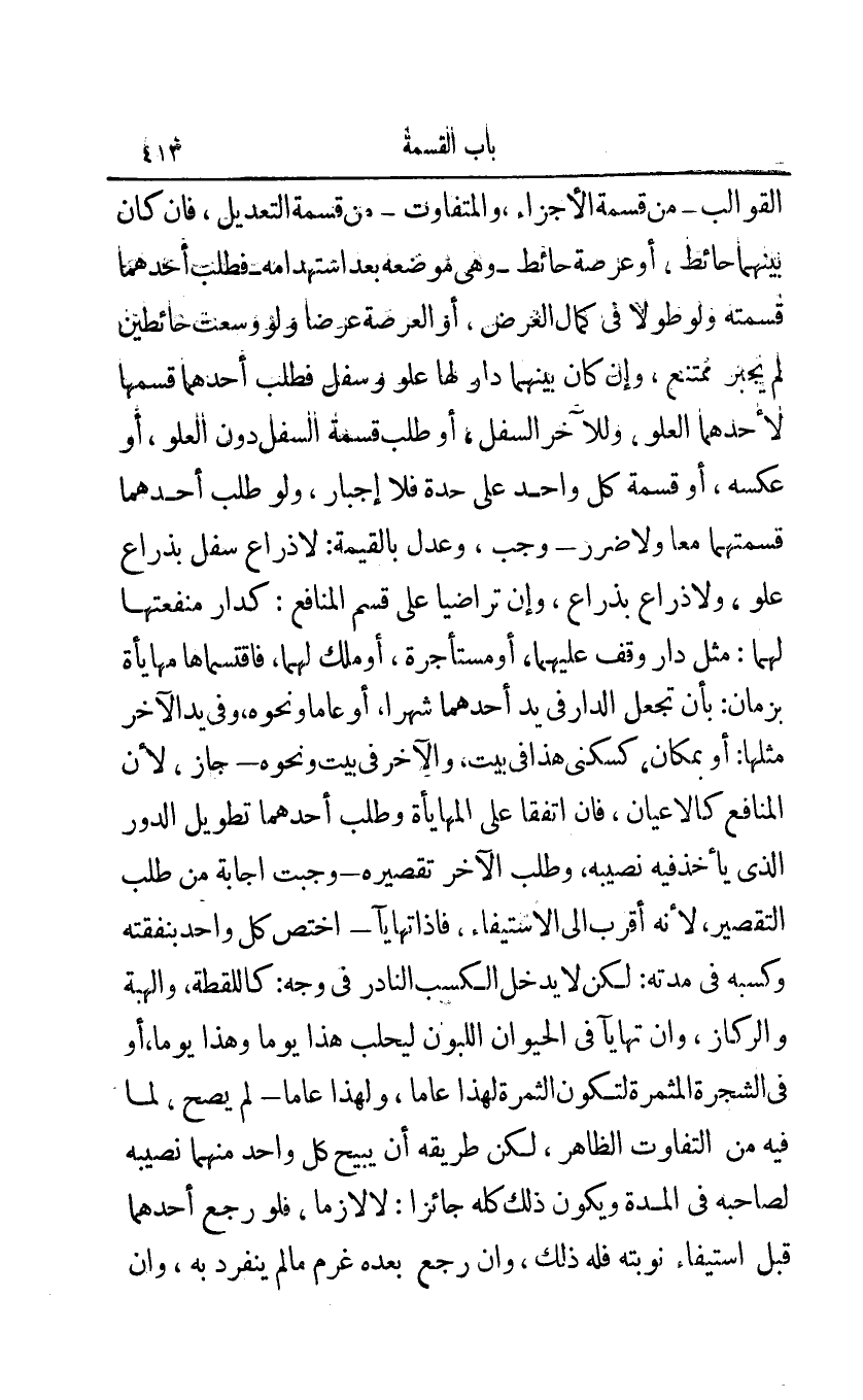 القوالب - من قسمة الأجزاء والمتفاوت - من قسمة التعديل فإن كان بينما حائط أو عرصة حائط - وهي موضعه بعد استهدامه - فطلب أحدهما قسمته ولو طولا في كمال العرض أو العرصة عرضا ولو وسعت حائطين لم يجبر ممتنع وإن كان بينهما دار لها علو وسفل فطلب أحدهما قسمها لأحدهما العلو وللآخر السفل أو طلب قسمة السفل دون العلو أو عكسه أو قسمة كل واحد على حدة فلا إجبار ولو طلب أحدهما قسمتهما معا ولا ضرر - وجب وعدل بالقيمة: لا ذراع سفل بذراع علو ولا ذراع بذراع وإن تراضيا على قسم المنافع: كدار منفعتها لهما: مثل دار وقف عليهما أو مستأجرة أو ملك لهما فاقتسماها مهايأة بزمان: بأن تجعل الدار في يد أحدهما شهرا أو عاما ونحوه وفي يد الآخر مثلها: أو بمكان كسكنى هذا في بيت والآخر في بيت ونحوه - جاز لأن المنافع كالأعيان فإن اتفقا على المهايأة وطلب أحدهما تطويل الدور الذي يأخذ فيه نصيبه وطلب الآخر تقصيره - اختص كل واحد بنفقته وكسبه في مدته: لكن لا يدخل الكسب النادر في وجه: كاللقطة والهبة والركاز وإن تهايآ في الحيوان اللبون ليحلب هذا يوما وهذا يوما أو في الشجرة المثمرة لتكون الثمرة لهذا عاما ولهذا عاما - لم يصح لما فيه من التفاوت الظاهر لكن طريقه أن يبيح كل واحد منهما نصيبه لصاحبه في المدة ويكون ذلك كله جائزا: لا لازما فلو رجع أحدهما قبل استيفاء نوبته فله ذلك وإن رجع بعده غرم ما لم ينفرد به وإن