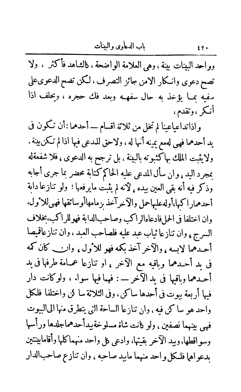 أحدهما: أن تكون في يد أحدهما فهي له مع يمينه أنها له ولا حق للمدعي فيها إذا لم تكن بينة ولا يثبت الملك بها كثبوته بالبينة بل ترجح به الدعوى فلا شفعة له بمجرد اليد وإن سأل المدعى عليه الحاكم كتابة محضر بما جرى أجابه وذكر فيه أنه بقي العين بيده لأنه لم يثبت ما يرفعها ولو تنازعا دابة أحدهما راكبا أو له عليها حمل والآخر آخذ بزمامها أو سائقها فهي للأول وإن اختلفا في الحمل فادعاه الراكب وصاحب الدابة فهو للراكب بخلاف السرج وإن تنازعا ثياب عبد عليه فلصاحب العبد وإن تنازعا قميصا أحدهما لابسه والآخر آخذ بكمه فهو للأول وإن كان كمه في يد أحدهما وباقيه مع الآخر أو تنازعا عمامة طرفها في يد أحدهما وباقيها في يد الآخر -: فهما فيها سواء ولو كانت دار فيها أربعة بيوت في أحدها ساكن وفي الثلاثة ساكن واختلفا فلكل واحد هو ساكن فيه وإن تنازعا الساحة التي يتطرق منها إلى البيوت فهي بينهما نصفين ولو كانت شاة مسلوخة بيد أحدهما جلدها ورأسها وسواقطها وبيد الآخر بقيتها وادعى كل واحد منهما كلها وأقاما بينتين بدعواهما فلكل واحد منهما ما بيد صاحبه وإن تنازع صاحب الدار