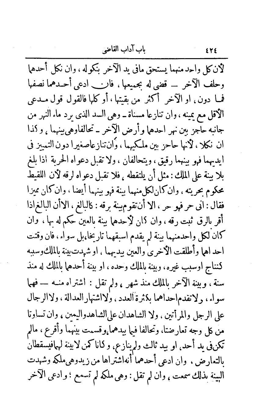 لأن كل واحد منهما يستحق ما في يد الآخر بنكوله وإن نكل أحدهما وحلف الآخر - قضى له بجميعها فإن ادعها أحدهما نصفها فما دون أو الآخر أكثر من بقيتها أو كلها فالقول قول مدعي الأقل مع يمينه وإن تنازعا مسناة - وهي السد الذي يرد ماء النهر من جانبه حاجز بين نهر أحدهما وأرض الآخر - تحالفا وهي بينهما وكذا إن نكلا لأنها حاجز بين ملكيهما وإن تنازعا صغيرا دون التمييز في أيديهما فهو بينهما رقيق ويتحالفان ولا تقبل دعواه الحرية إذا بلغ بلا بينة على الملك: مثل أن يلتقطه فلا تقبل دعواه لرقه لأن اللقيط محكوم بحريته وإن كان لكل منهما بينة فهو بينهما أيضا وإن كان مميزا فقال: إني حر فهو حر إلا أن تقوم بينة برقة: كالبالغ إلا أن البالغ إذا أقر بالرق ثبت رقه وإن كان لأحدهما بينة بالعين حكم له بها وإن كان لكل واحد منهما بينة لم يقدم أسبقهما تاريخا بل سواء فإن وقتت إحداهما وأطلقت الأخرى والعين بيدهما أو شهدت بينة بالملك وسببه كنتاج أو سبب غيره وبينة بالملك وحده أو بينة أحدهما بالملك له منذ سنة وبينة الآخر بالملك منذ شهر ولم تقل: اشتراه من - فهما سواء ولا تقدم إحداهما بكثرة العدد ولا اشتهار العدالة ولا الرجال على الرجل والمرأتين ولا الشاهدان على الشاهد واليمين وإن تساوتا من كل وجه تعارضتا وتحالفا فيما بيدهما وقسمت بينهما وأقرع ما لم تكن في يد أحد أو بيد ثالث ولم ينازع وكانا كمن لا بين لهما فيسقطان بالتعارض وإن ادعى أحدهما أنه اشتراها من زيد وهي ملكه وشهدت البينة بذلك سمعت وإن لم تقل: وهي ملكه لم تسمع وادعى الآخر