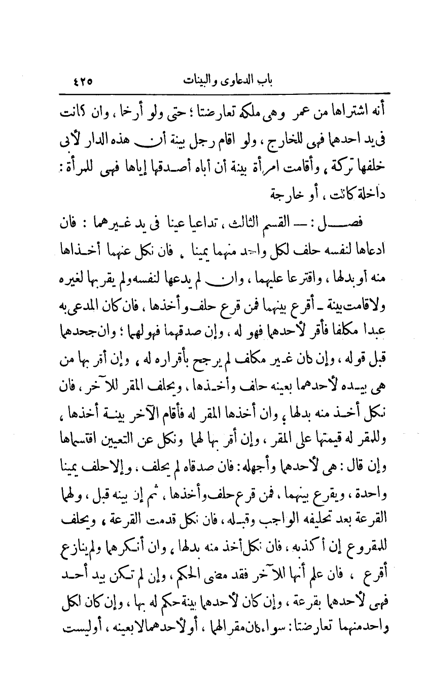أنه اشتراها من عمر وهي ملكه تعارضتا حتى ولو أرخا وإن كانت في يد أحدهما فهي للخارج ولو أقام رجل بينة أن هذه الدار لأبي خلفها تركة وأقامت امرأة بينة أن أباه أصدقها إياها فهي للمرأة: داخلة كانت أو خارجة.