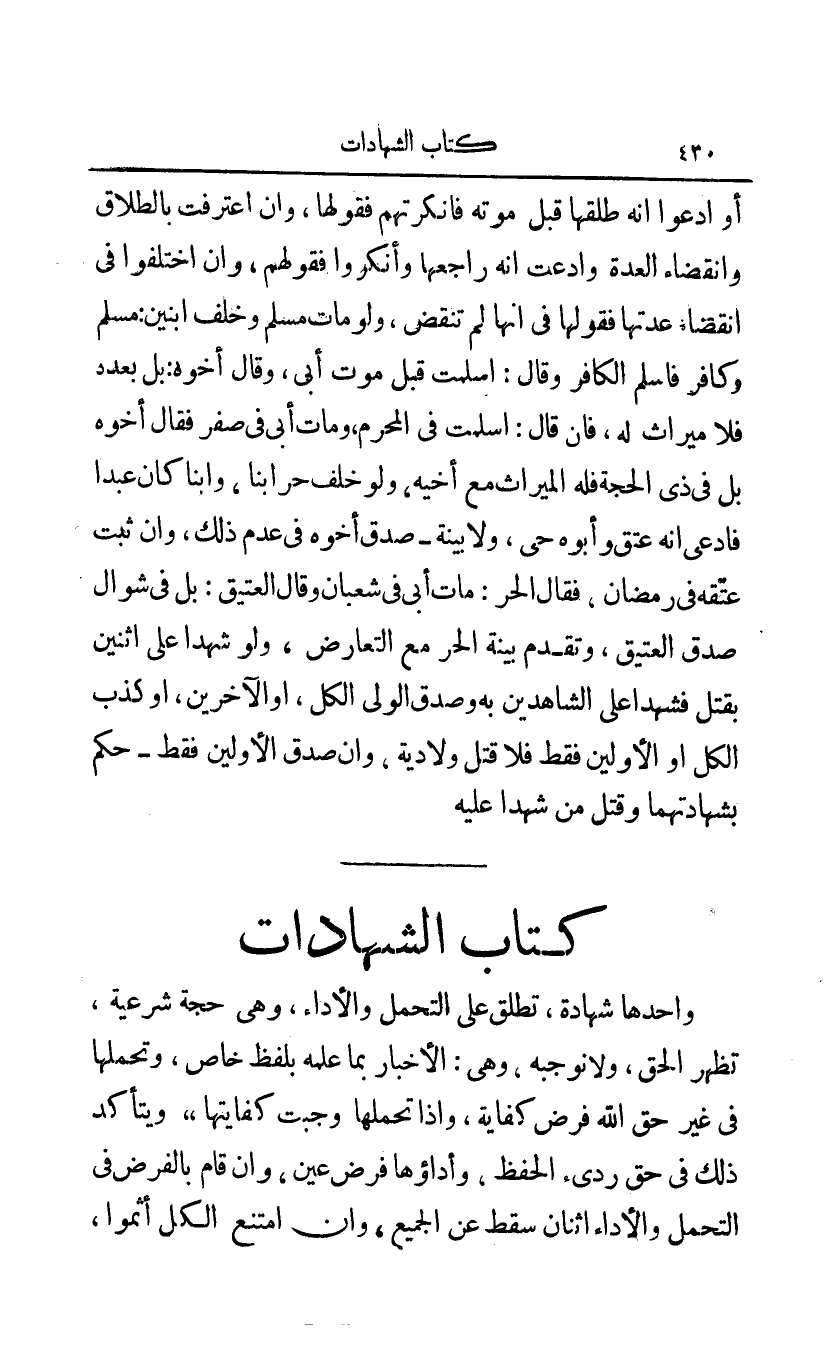 وأحدها شهادة تطلق على التحمل والأداء وهي حجة شرعية تظهر الحق ولا نوجبه وهي: الأخبار بما علمه بلفظ خاص وتحملها في غير حق الله فرض كفاية وإذا تحملها وجبت كفايتها ويتأكد ذلك في حق رديء الحفظ وأداؤها فرض عين وإن قام بالفرض في التحمل والأداء اثنان سقط عن الجميع وإن امتنع الكل أثموا،