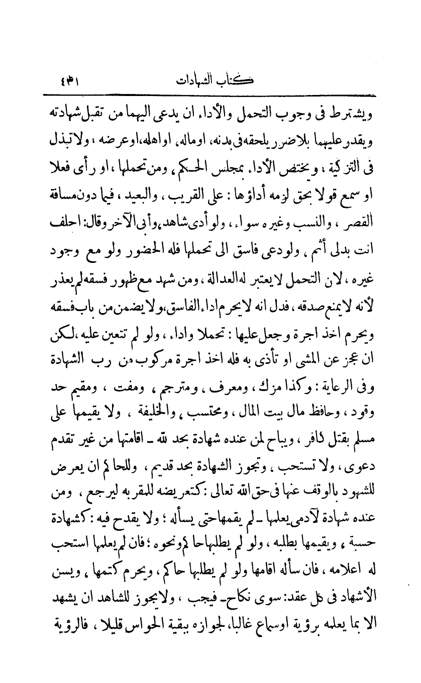 ويشترط في وجوب التحمل والأداء أن يدعى إليهما من تقبل شهادته ويقدر عليهما بلا ضرر يلحقه في بدنه أو ماله أو أهله أو عرضه ولا تبذل في التزكية ويختص الأداء بمجلس الحكم ومن تحملها أو رأى فعلا أو سمع قولا بحق لزمه أداؤها: على القريب والبعيد فيما دون مسافة القصر والنسب وغيره سواء ولو أدى شاهد وأبى الآخر وقال: احلف أنت بدلي أثم ولو دعي فاسق إلى تحملها فله الحضور ولو مع وجود غيره لأن التحمل لا يعتبر له العدالة ومن شهد مع ظهور فسقه لم يعذر لأنه لا يمنع صدقه فدل أنه لا يحرم أداء الفاسق ولا يضمن من باب فسقه ويحرم أخذ أجرة وجعل عليها: تحملا وأداء ولو لم تتعين عليه لكن إن عجز عن المشي أو تأذى به فله أخذ أجرة مركوب من رب الشهادة وفي الرعاية: وكذا مزك ومعرف ومترجم ومفت ومقيم حد وقود وحافظ مال بيت المال ومحتسب والخليفة ولا يقيمها على مسلم بقتل كافر ويباح لمن عنده شهادة بحد لله - أقامتها من غير تقدم دعوى ولا تستحب وتجوز الشهادة بحد قديم وللحاكم أن يعرض للشهود بالوقف عنها في حق الله تعالى: كتعريضه للمقربة ليرجع ومن عنده شهادة لآدمي يعلمها - لم يقمها حتى يسأله ولا يقدح فيه: كشهادة حسبة ويقيمها بطلبه ولو لم يطلبها حاكم ويحرم كتمها ويسن الإشهاد في كل عقد: سوى نكاح - فيجب ولا يجوز للشاهد أن يشهد إلا بما يعلمه برؤية أو سماع غالبا لجوازه ببقية الحواس قليلا، فالرؤية