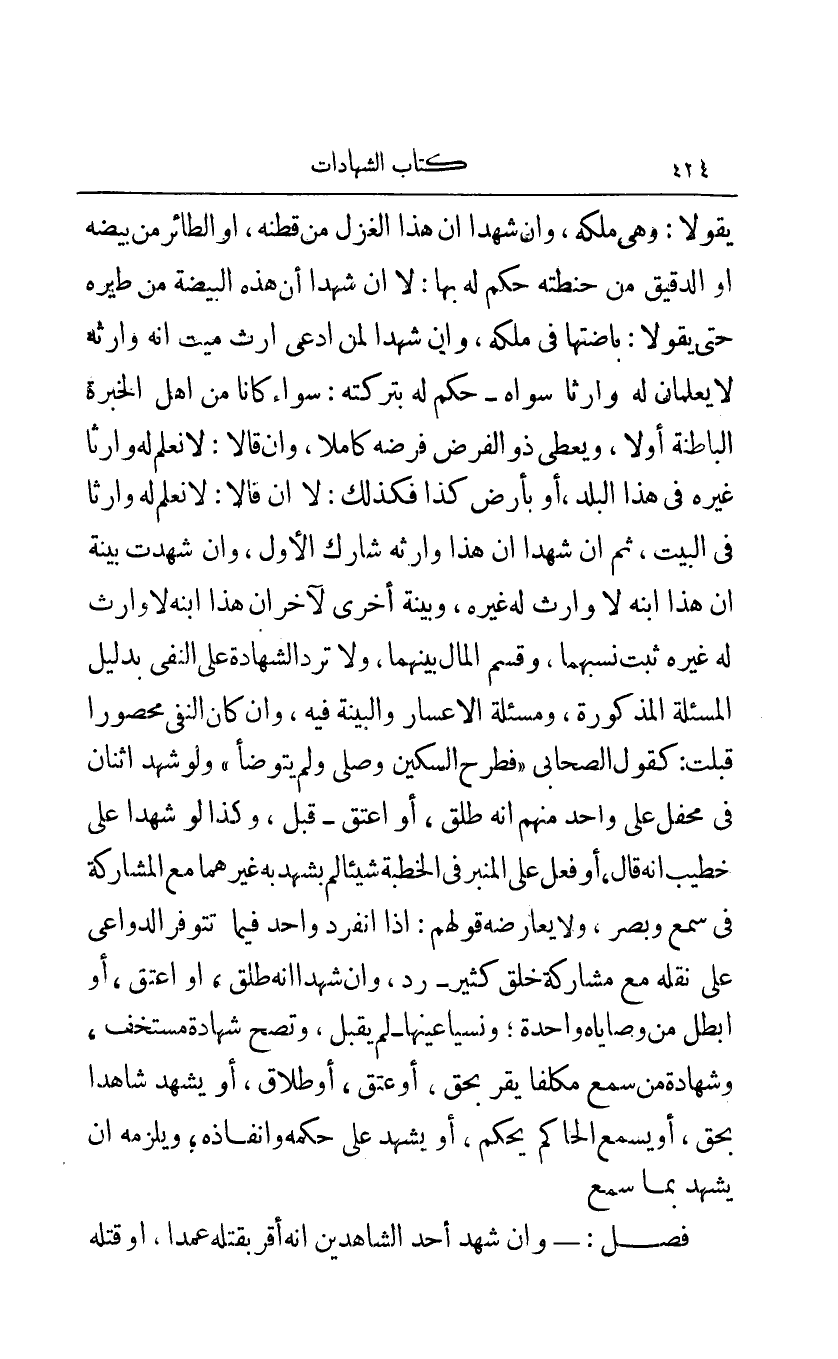 يقولا: وهي ملكه وإن شهدا أن هذا الغزل من قطنه أو الطائر من بيضه أو الدقيق من حنطته حكم له بها: لا إن شهدا أن هذه البيضة من طيره حتى يقولا: باضتها في ملكه وإن شهدا لمن ادعى إرث ميت أنه وارثه لا يعلمان له وارثا سواه - حكم له بتركته: سواء كانا من أهل الخبرة الباطنة أو لا ويعطي ذو الفرض فرضه كاملا وإن قالا: لا نعلم له وارثا غيره في هذا البلد أو بأرض كذا فكذلك: لا إن قالا: لا نعلم له وارثا في البيت ثم إن شهدا أن هذا وارثه شارك الأول وإن شهدت بينة أن هذا ابنه لا وارث له غيره وبينة أخرى لآخر أن هذا ابنه لا وارث له غيره ثبت نسبهما وقسم المال بينهما ولا ترد الشهادة على النفي بدليل المسئلة المذكورة ومسئلة الإعسار والبينة فيه وإن كان النفي محصورا قبلت: كقول الصحابي "فطرح السكني وصلى ولم يتوضأ" ولو شهد اثنان في محفل على واحد منهم أنه طلق أو أعتق - قبل وكذا لو شهدا على خطيب أنه قال أو فعل على المنبر في الخطبة شيئا لم يشهد به غيرهما مع المشاركة في سمع وبصر ولا يعارضه قولهم: إذا انفرد واحد فيما تتوفر الدواعي على نقله مع مشاركة خلق كثير - رد وإن شهدا أنه طلق أو أعتق أو أبطل من وصاياه واحدة ونسيا عينها - لم يقبل وتصح شهادة مستخف وشهادة من سمع مكلفا يقر بحق أو عتق أو طلاق أو يشهد شاهدا بحق أو يسمع الحاكم يحكم أو يشهد على حكمه وإنفاذه ويلزمه أن يشهد بما سمع.