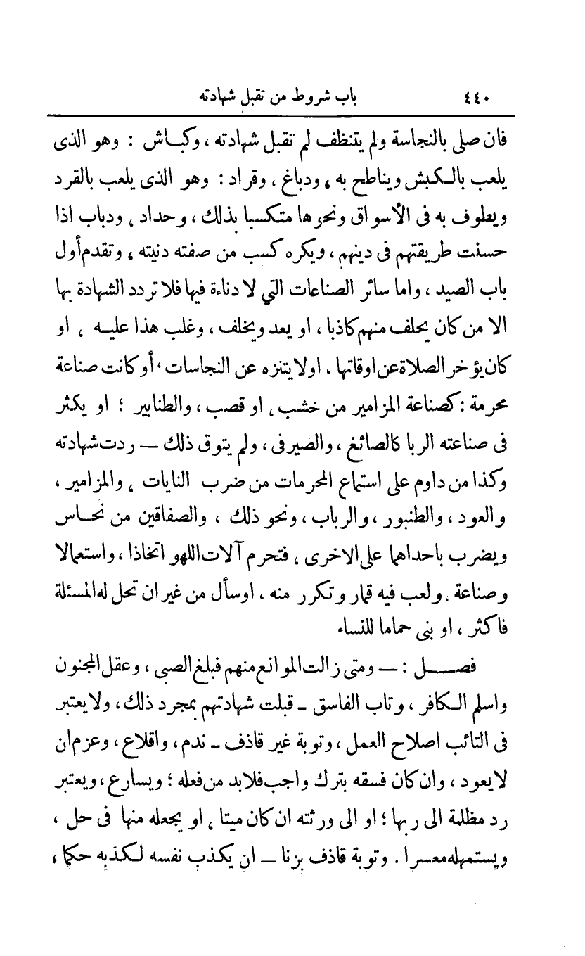فإن صلى بالنجاسة ولم يتنظف لم تقبل شهادته وكباش: وهو الذي يلعب بالكبش ويناطح به ودباغ وقراد: وهو الذي يلعب بالقرد ويطوف به في الأسواق ونحوها متكسبا بذلك وحداد ودباب إذا حسنت طريقتهم في دينهم ويكره كسب من صفته دنيته وتقدم أول باب الصيد وأما سائر الصناعات التي لا دناءة فيها فلا ترد الشهادة بها إلا من كان يحلف منهم كاذبا أو يعد ويخلف وغلب هذا عليه أو كان يؤخر الصلاة عن أوقاتها أو لا يتنزه عن النجاسات أو كانت صناعة محرمة: كصناعة المزامير من خشب أو قصب والطنابير أو يكثر في صناعته الربا كالصائغ والصيرفي ولم يتوق ذلك - ردت شهادته وكذا من داوم على استماع المحرمات من ضرب النايات والمزامير والعود والطنبور والرباب ونحو ذلك والصفاقين من نحاس ويضرب بإحداهما على الأخرى فتحرم آلات اللهو اتخاذا واستعمالا وصناعة ولعب فيه قمار وتكرر منه أو سأل من غير أن تحل له المسئلة فأكثر أو بنى حماما للنساء.