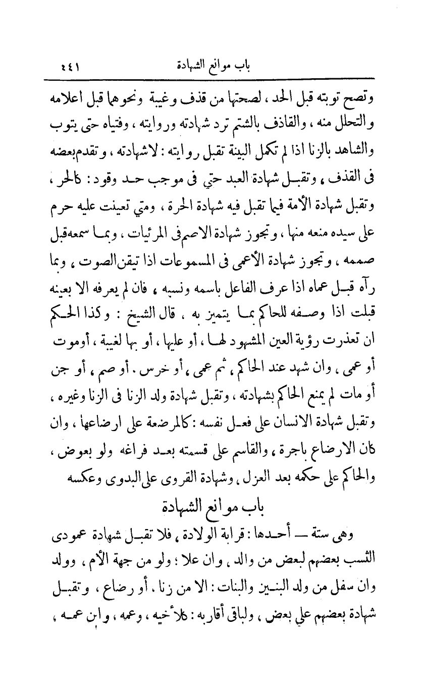 وهي ستة - أحدها: قرابة الولادة فلا تقبل شهادة عمودي النسب بعضهم لبعض من والد وإن علا ولو من جهة الأم وولد وإن سفل من ولد البنين والبنات: إلا من زنا أو رضاع وتقبل شهادة بعضهم على بعض ولباقي أقاربه: كلأخيه وعمه، وابن عمه،