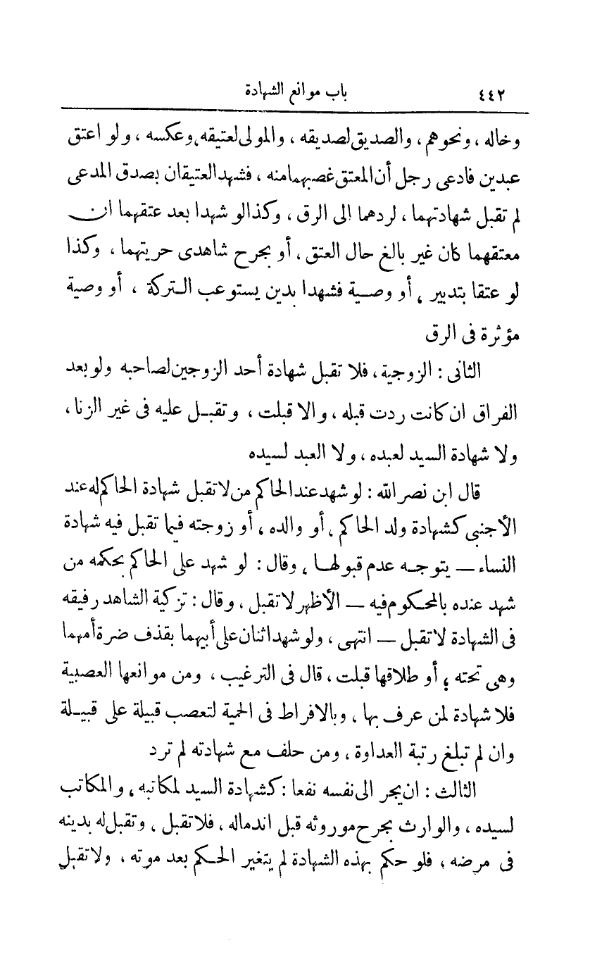 الثاني: الزوجية فلا تقبل شهادة أحد الزوجين لصاحبه ولو بعد الفراق إن كانت ردت قبله وإلا قبلت وتقبل عليه في غير الزنا ولا شهادة السيد لعبده ولا العبد لسيده.