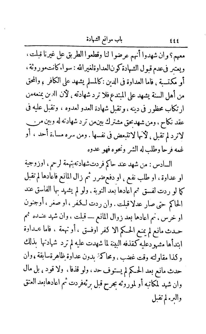 السادس: من شهد عند حاكم فردت شهادته بتهمة لرحم أو زوجية أو عداوة أو طلب نفع أو دفع ضرر ثم زال المانع فأعادها لم تقبل كما لو ردت لفسق ثم أعادها بعد التوبة ولو لم يشهد بها الفاسق عند الحاكم حتى صار عدلا قبلت وإن ردت لكفر أو صغر أو جنون أو خرس نم أعادها بعد زوال المانع - قبلت وإن شهد عنده ثم حدث مانع لم يمنع الحكم إلا كفر أو فسق أو تهمة فأما عداوة ابتدأها مشهود عليه كقذفه البينة لما شهدت عليه لم ترد شهادتها بذلك وكذا مقاولته وقت غضب ومحاكمة بدون عداوة ظاهرة سابقة وإن حدث مانع بعد الحكم لم يستوف حد ولو قذفا ولا قود بل مال وإن شهد لمكاتبه أو لموروثه بجرح قبل برئه فردت ثم أعادها بعد العتق والبرء لم تقبل.