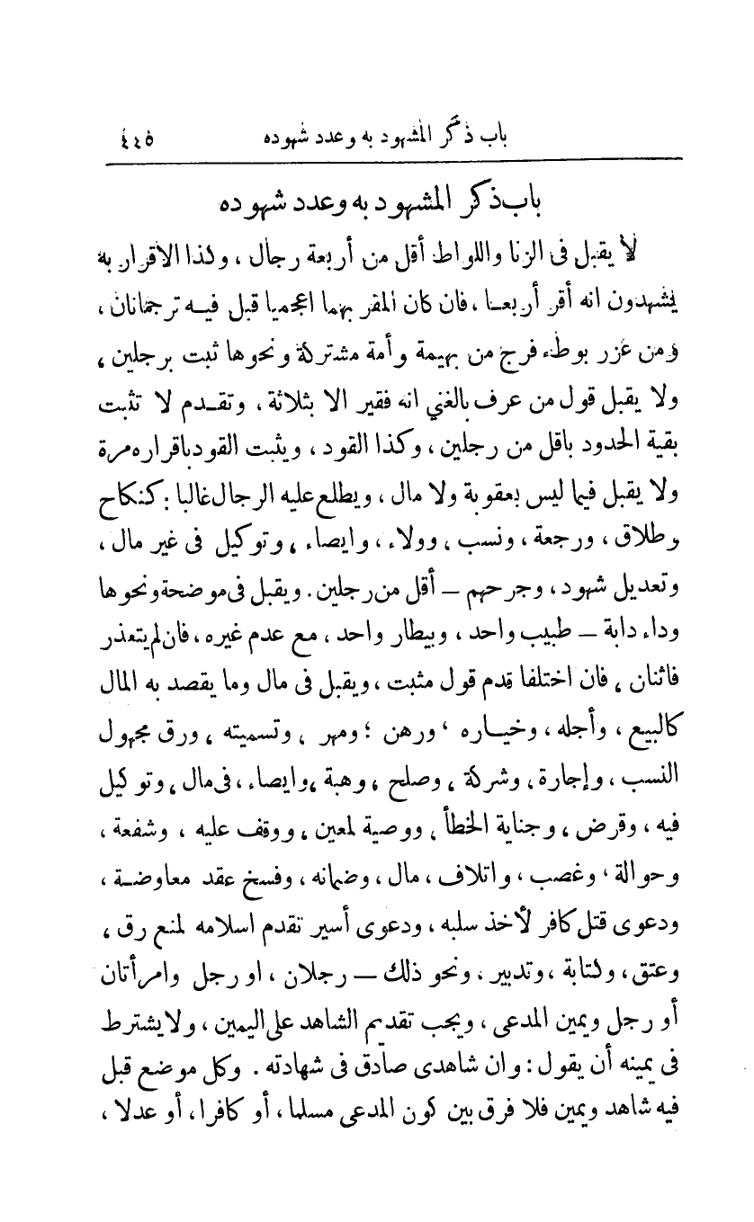 لا يقبل في الزنا واللواط أقل من أربعة رجال وكذا الإقرار به يشهدون أنه أقر أربعا فإن كان المقر بهما أعجميا قبل فيه ترجمانان ومن عزر بوطء فرج من بهيمة وأمة مشتركة ونحوها ثبت برجلين ولا يقبل قول من عرف بالغني أنه فقير إلا بثلاثة وتقدم لا تثبت بقية الحدود بأقل من رجلين وكذا القود ويثبت القود بإقراره مرة ولا يقبل فيما ليس بعقوبة ولا مال ويطلع عليه الرجال غالبا: كنكاح وطلاق ورجعة ونسب وولاء وإيصاء وتوكيل في غير مال وتعديل شهود وجرحهم - أقل من رجلين ويقبل في موضحة ونحوها وداء دابة - طبيب واحد وبيطار واحد مع عدم غيره فغن لم يتعذر فاثنان فإن اختلفا قدم قول مثبت ويقبل في ماله وما يقصد به المال كالبيع وأجله خياره ورهن ومهر وتسميته ورق مجهول النسب وإجارة وشركة ومصلح وهبة وإيصاء في مال وتوكيل فيه وقرض وجناية الخطأ ووصية لمعين ووقف عليه وشفعة وحوالة وغصب وإتلاف وما ل وضمانة فسخ عقد معاوضة ودعوى قتل كافر لأخذ سلبه ودعوى أسير تقدم إسلامه لمنع رق وعتق وكتابة وتدبير ونحو ذلك - رجلان أو رجل وامرأتان أو رجل ويمين المدعي وجب تقديم الشاهد على اليمين ولا يشترط في يمينه أن يقول: وإن شاهدي صادق في شهادته وكل موضع قبل فيه شاهد ويمين فلا فرق بين كون المدعي مسلما أو كافرا أو عدلا،