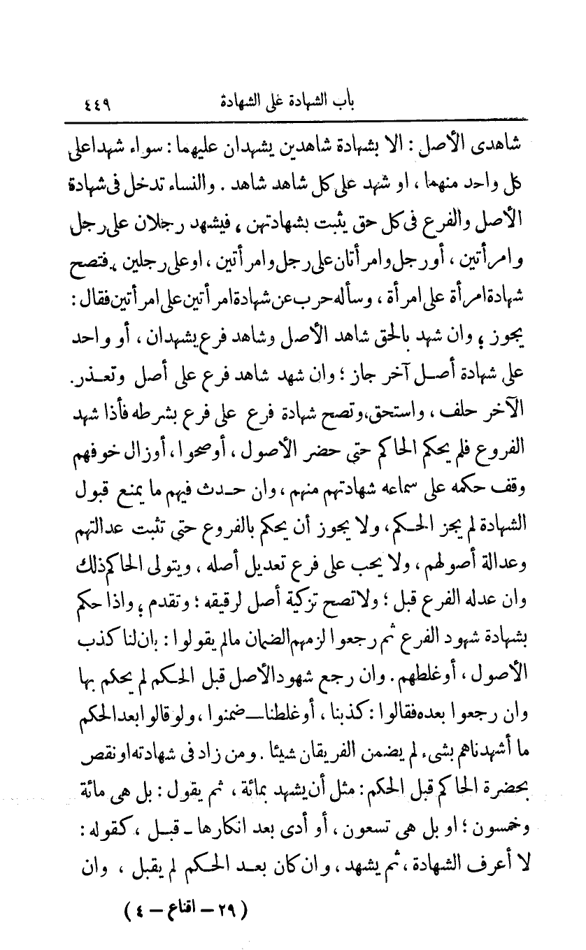 شاهدي الأصل: إلا بشهادة شاهدين يشهدان عليهما: سواء شهدا على كل واحد منهما أو شهد على كل شاهد شاهد والنساء تدخل في شهادة الأصل والفرع في كل حق يثبت بشهادتهن فيشهد رجلان على رجل وامرأتين أو رجل وامرأتان على رجل وامرأتين أو على رجلين فتصح شهادة امرأة على امرأة وسأله حرب عن شهادة امرأتين على امرأتين فقال: يجوز وإن شهد بالحق شاهد الأصل وشاهد فرع يشهدان أو واحد على شهادة أصل آخر جاز وإن شهد شاهد فرع على أصل وتعذر الآخر حلف واستحق وتصح شهادة فرع على فرع بشرطه فإذا شهد الفروع فلم يحكم الحاكم حتى حضر الأصول أو صحوا أو زال خوفهم وقف حكمه على سماعه شهادتهم منهم وإن حدث فيهم ما يمنع قبول الشهادة لم يجز الحكم ولا يجوز أن يحكم بالفروع حتى تثبت عدالتهم وعدالة أصولهم ولا يجب على فرع تعديل أصله ويتولى الحاكم ذلك وإن عدله الفرع قبل ولا تصح تزكية أصل لرقيقه وتقدم وإذا حكم بشهادة شهود الفرع ثم رجعوا لزمهم الضمان ما لم يقولوا: بان لنا كذب الأصول أو غلطهم وإن رجع شهود الأصل قبل الحكم لم يحكم بها وإن رجعوا بعده فقالوا: كذبنا أو غلطنا - ضمنوا ولو قالوا بعد الحكم ما أشهدناهم بشيء لم يضمن الفريقان شيئا ومن زاد في شهادته أو نقص بحضرة الحاكم قبل الحكم: مثل أن يشهد بمائة ثم يقول: بل هي مائة وخمسون أو بل هي تسعون أو أدى بعد إنكارها - قبل كقوله: لا أعرف الشهادة ثم يشهد وإن كان بعد الحكم لم يقبل وإن