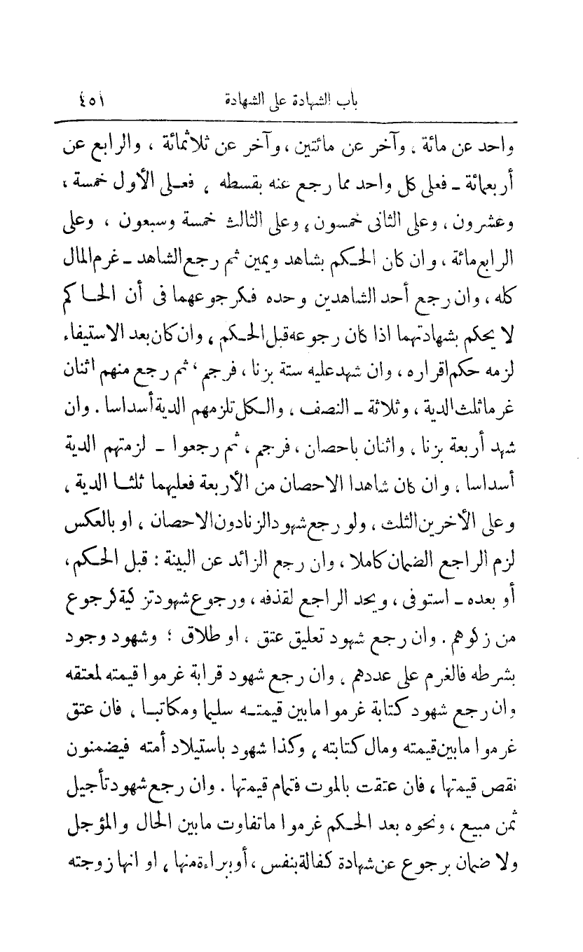 واحد عن مائة وآخر عن مائتين وآخر عن ثلاثمائة والرابع عن أربعمائة - فعلى كل واحد مما رجع عنه بقسطه فعلى الأول خمسة وعشرون وعلى الثاني خمسون وعلى الثالث خمسة وسبعون وعلى الرابع مائة وإن كان الحكم بشاهد ويمين ثم رجع الشاهد - غرم المال كله وإن رجع أحد الشاهدين وحده فكرجوعهما في أن الحاكم لا يحكم بشهادتهما إذا كان رجوعه قبل الحكم وإن كان بعد الاستيفاء لزمه حكم إقراره وإن شهد عليه ستة بزنا فرجم ثم رجع منهم اثنان غرما ثلث الدية وثلاثة - النصف والكل تلزمهم الدية أسداسا وإن شهد أربعة بزنا واثنان بإحصان فرجم ثم رجعوا - لزمتهم الدية أسداسا وإن كان شاهدا الإحصان من الأربعة فعليهما ثلثا الدية وعلى الأخرين الثلث ولو رجع شهود الزنا دون الإحصان أو بالعكس لزم الراجع الضمان كاملا وإن رجع الزائد عن البينة: قبل الحكم أو بعده - استوفى ويحد الراجع لقذفه ورجوع شهود تزكية كرجوع من زكوهم وإن رجع شهود تعليق عتق أو طلاق وشهود وجود بشرطه فالغرم على عددهم وإن رجع شهود قرابة غرموا قيمته لمعتقه وإن رجع شهود كتابة غرموا ما بين قيمته سليما ومكاتبا فإن عتق غرموا ما بين قيمته ومال كتابته وكذا شهود باستيلاء أمته فيضمنون نقص قيمتها فإن عتقت بالموت فتمام قيمتها وإن رجع شهود تأجيل ثمن مبيع ونحوه بعد الحكم غرموا ما تفاوت ما بين الحال والموجل ولا ضمان برجوع عن شهادة كفالة بنفس أو ببراءة منها أو أنها زوجته