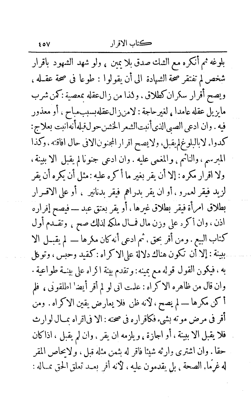 بلوغه ثم أنكره مع الشك صدق بلا يمين، ولو شهد الشهود بإقرار شخص لم تفتقر صحة الشهادة إلى أن يقولوا: طوعا في صحة عقله ويصح إقرار سكران كطلاق وكذا من زال عقله بمعصية: كمن شرب ما يزيل عقله عامدا لغير حاجة: لا من زال عقله بسبب مباح أو معذور فيه وإن ادعى الصبي الذي أنبت الشعر الخشن حول قبله أنه أنبت بعلاج: كدواء لا بالبلوغ لم يقبل ولا يصح إقرار المجنون إلا في حال إفاقته وكذا المبرسم والنائم والمغمى عليه وإن ادعى جنونا لم يقبل إلا ببينة ولا إقرار مكره: إلا أن يقر بغير ما أكره عليه: مثل أن يكره أن يقر لزيد فيقر لعمرو أو أن يقر بدراهم فيقر بدنانير أو على الإقرار بطلاق امرأة فيقر بطلاق غيرها أو يقر بعتق عبد - فيصح إقراره إذن وإن أكره على وزن مال فمال ملكه لذلك صح وتقدم أول كتاب البيع ومن أقر بحق ثم ادعى أنه كان مكرها - لم يقبل إلا ببينة: إلا أن تكون هناك دلالة على الإكراه: كقيد وحبس وتوكل به فيكون القول قوله مع يمينه: وتقدم بينة إكراه على بينة طواعية وإن قال من ظاهره الإكراه: علمت أني لو لم أقر أيضا أطلقوني فلم أكن مكرها - لم يصح لأنه ظن فلا يعارض يقين الإكراه ومن أقر في مرض موته بشيء فكإقراره في صحته: إلا في إقراره بمال لوارث فلا يقبل إلا ببينة أو إجازة ويلزمه أن يقر وإن لم يقبل إذا كان حقا وإن اشترى وارثه شيئا فأقر له بثمن مثله قبل ولا يحاص المقر له غرماء الصحة بل يقدمون عليه لأنه أقر بعد تعلق الحق بماله: