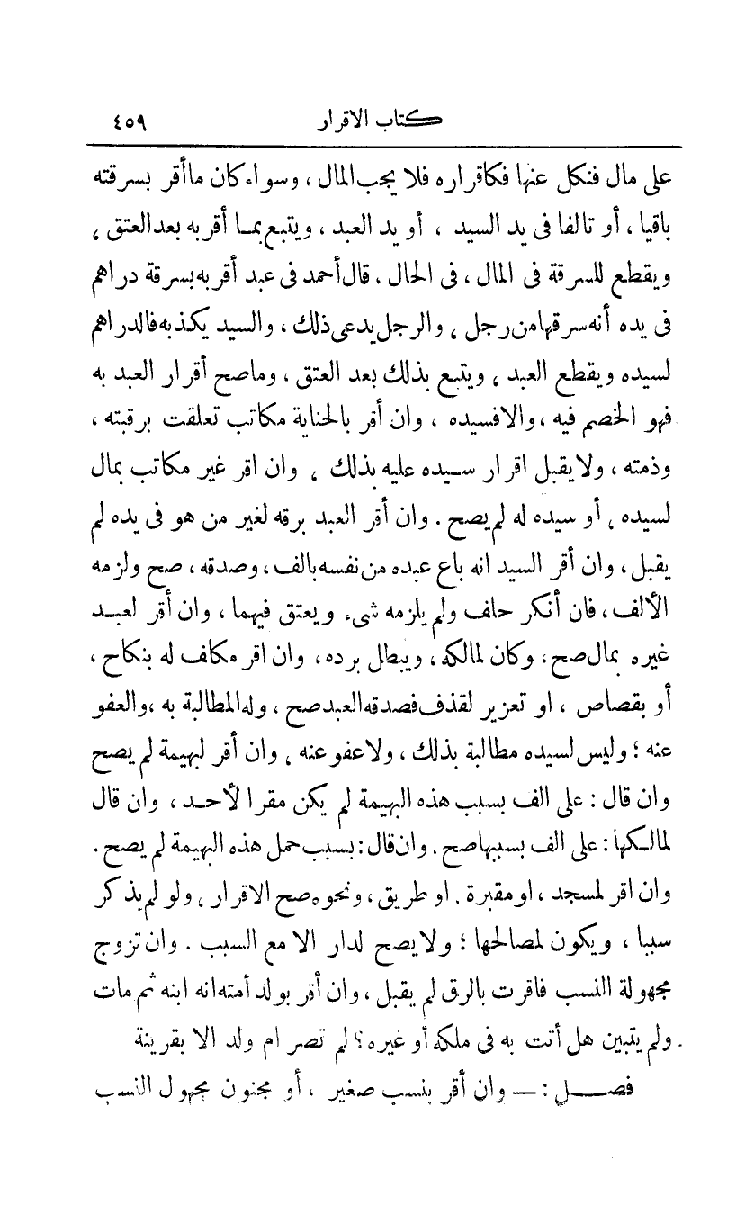 على مال فنكل عنها فكإقراره فلا يجب المال وسواء كان ما أقر بسرقته باقيا أو تالفا في يد السيد أو يد العبد ويتبع بما أقر به بعد العتق ويقطع للسرقة في المال في الحال قال أحمد في عبد أقر به بسرقة دراهم في يده أنه سرقها من رجل والرجل يدعي ذلك والسيد يكذبه فالدراهم لسيده ويقطع العبد ويتبع بذلك بعد العتق وما صح إقرار العبد به فهو الخصم فيه وإلا فسيده وإن أقر بالجناية مكاتب تعلقت برقبته وذمته ولا يقبل إقرار سيده عليه بذلك وإن أقر غير مكاتب بمال لسيده أو سيده له لم يصح وإن أقر العبد برقة لغير من هو في يده لم يقبل وإن أقر السيد أنه باع عبده من نفسه بألف وصدقه صح ولزمه الألف فإن أنكر حلف ولم يلزمه شيء ويعتق فيهما وإن أقر لعبد غيره بمال صح وكان لمالكه ويبطل برده وإن أقر مكلف له بنكاح أو بقصاص أو تعزير لقذف فصدقه العبد صح وله المطالبة به والعفو عنه وليس لسيده مطالبة بذلك ولا عفو عنه وإن أقر لبهيمة لم يصح وإن قال: علي ألف بسبب هذه البهيمة لم يكن مقرا لأحد وإن قال لمالكها: علي ألف بسببها صح وإن قال: بسبب حمل هذه البهيمة لم يصح وإن أقر لمسجد أو مقبرة أو طريق ونحوه صح الإقرار ولو لم يذكر سببا ويكون لمصالحها ولا يصح لدار إلا مع السبب وإن تزوج مجهولة النسب فأقرت بالرق لم يقبل وإن أقر بولد أمته أنه ابنه ثم مات ولم يتبين هل أتت به في ملكه أو غيره؟ لم تصر أم ولد إلا بقرينة.