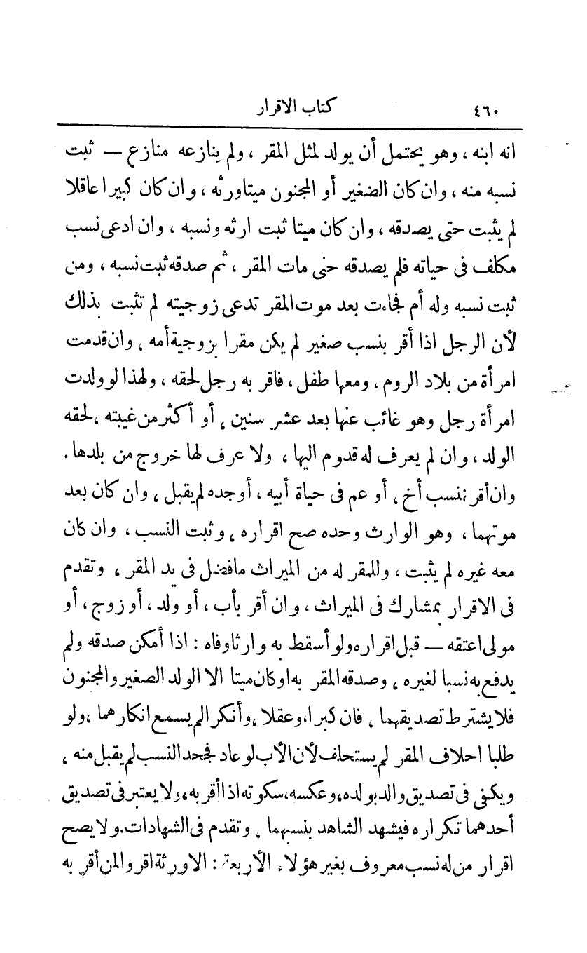 وهو يحتمل أن يولد لمثل المقر ولم ينازعه منازع - ثبت نسبه منه وإن كان الصغير أو المجنون ميتا ورثه وإن كان كبيرا عاقلا لم يثبت حتى يصدقه وإن كان ميتا ثبت إرثه ونسبه وإن ادعى نسب مكلف في حياته فلم يصدقه حتى مات المقر ثم صدقه ثبت نسبه ومن ثبت نسبه وله أم فجاءت بعد موت المقر تدعي زوجيته لم تثبت بذلك لأن الرجل إذا أقر بنسب صغير لم يكن مقرا بزوجية أمه وإن قدمت امرأة من بلاد الروم ومعها طفل فأقر به رجل لحقه ولهذا لو ولدت امرأة رجل وهو غائب عنها بعد عشر سنين أو أكثر من غيبته لحقه الولد وإن لم يعرف له قدوم إليها ولا عرف لها خروج من بلدها وإن أقر بنسب أخ أو عم في حياة أبيه أو جده لم يقبل وإن كن بعد موتهما وهو الوارث وحده صح إقراره وثبت النسب وإن كان معه غيره لم يثبت وللمقر له من الميراث ما فضل في يد المقر وتقدم في الإقرار بمشارك في الميراث وإن أقر بأب أو ولد أو زوج أو مولى أعتقه - قبل إقراره ولو أسقط به وارثا وفاه: إذا أمكن صدقه ولم يدفع به نسبا لغيره وصدقه المقر به أو كان ميتا إلا الولد الصغير والمجنون فلا يشترط تصديقهما فإن كبرا وعقلا وأنكرا لم يسمع إنكارهما ولو طلبا إحلاف المقر لم يستحلف لأن الأب لو عاد فجحد النسب لم يقبل منه ويكفي في تصديق والد بولده وعكسه سكوته إذا أقر به ولا يعتبر في تصديق أحدهما تكراره فيشهد الشاهد بنسبهما وتقدم في الشهادات ولا يصح إقرار من له نسب معروف بغير هؤلاء الأربعة: إلا ورثة أقروا لمن أقر به