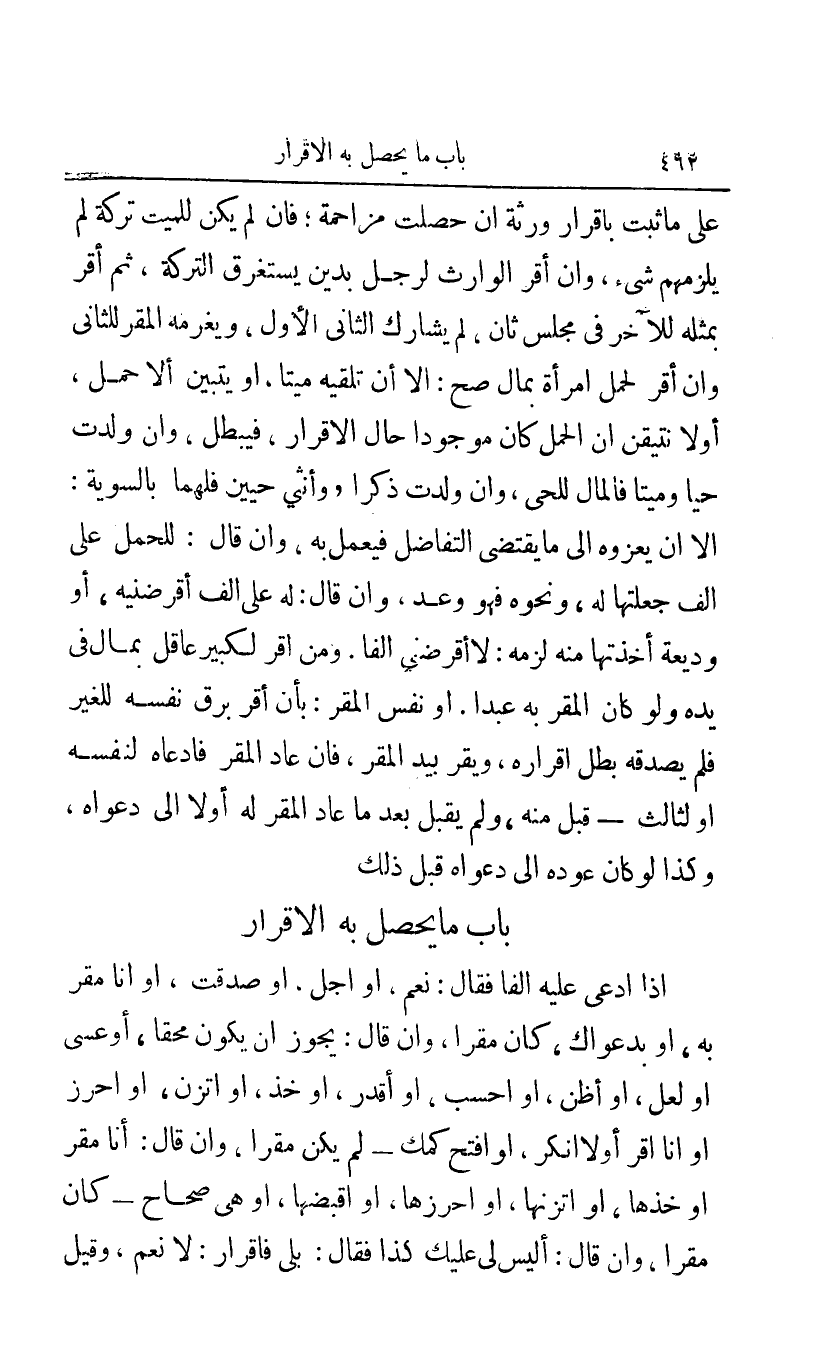 على ما ثبت بإقرار ورثة إن حصلت مزاحمة: فإن لم يكن للميت تركة لم يلزمهم شيء وإن أقر الوارث لرجل بدين يستغرق التركة ثم أقر بمثله للآخر في مجلس ثاني لم يشارك الثاني الأول ويغرمه المقر للثاني وإن أقر لحمل امرأة بمال صح: إلا أن تلقيه ميتا أو يتبين إلا حمل أو لا نتيقن أن الحمل كان موجودا حال الإقرار فيبطل وإن ولدت حيا وميتا فالمال حي وإن ولدت ذكرا وأنثى حيين فلهما بالسوية: إلا أن يعزوه إلى ما يقتضي التفاضل فيعمل به وإن قال: للحمل على ألف جعلتها له ونحوه فهو وعد وإن قال: له علي ألف أقرضنيه أو وديعة أخذتها منه لزمه: لا أقرضني ألفا ومن أقر لكبير عاقل بمال في يده ولو كان المقر به عبدا أو نفس المقر: بأن أقر برق نفسه للغير فلم يصدقه بطل إقراره ويقر بيد المقر فإن عاد المقر فادعاه لنفسه أو لثالث - قبل منه ولم يقبل بعد ما عاد المقر له أولا إلى دعواه وكذا لو كان عوده إلى دعواه قبل ذلك.