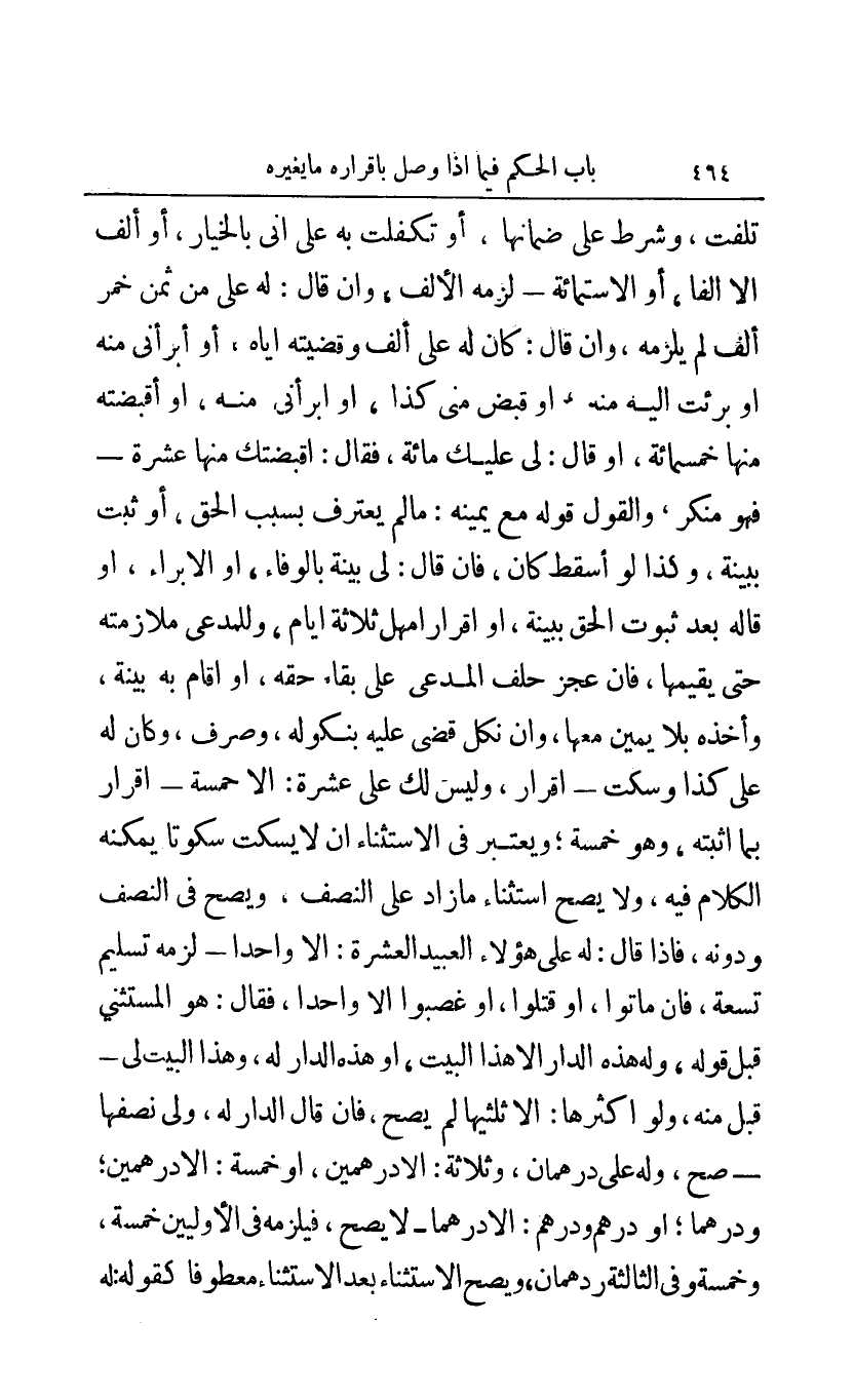تلفت وشرط على ضمانها أو تكفلت به على أني بالخيار أو ألف إلا ألفا أو الاستمائة - لزمه الألف وإن قال: له علي من ثمن خمر ألف لم يلزمه وإن قال: كان له علي ألف وقضيته إياه أو أبرأني منه أو برئت إليه منه أو قبض مني كذا أو أبرأني منه أو أقبضته منها خمسمائة أو قال: لي عليك مائة فقال: أقبضتك منها عشرة - فهو منكر والقول قوله مع يمينه: ما لم يعترف بسبب الحق أو ثبت ببينة وكذا لو أسقط كان فإن قال: لي بينة بالوفاء أو الإبراء أو قاله بعد ثبوت الحق ببينة أو إقرار مهل ثلاثة أيام وللمدعي ملازمته حتى يقيمها فإن عجز حلف المدعي على بقاء حقه أو أقام به بينة وأخذه بلا يمين معها وإن نكل قضى عليه بنكوله وصرف وكان له علي كذا وسكت - إقرار وليس لك علي عشرة: إلا خمسة - إقرار بما أثبته وهو خمسة ويعتبر في الاستثناء أن لا يسكت سكوتا يمكنه الكلام فيه ولا يصح استثناء ما زاد على النصف ويصح في النصف ودونه فإذا قال: له على هؤلاء العبيد العشرة: إلا واحدا - لزمه تسليم تسعة فإن ماتوا أو قتلوا أو غصبوا إلا واحدا فقال: هو المستثني قبل قوله وله هذه الدار إلا هذا البيت أو هذه الدار له وهذا البيت لي - قبل منه ولو أكثرها: إلا ثلثيها لم يصح فإن قال الدار له ولي نصفها - صح وله علي درهمان وثلاثة: إلا درهمين أو خمسة: إلا درهمين ودرهما أو درهم ودرهم: إلا درهما - لا يصح فيلزمه في الأوليين خمسة وخمسة وفي الثالثة درهمان ويصح الاستثناء بعد الاستثناء معطوفا كقوله: له