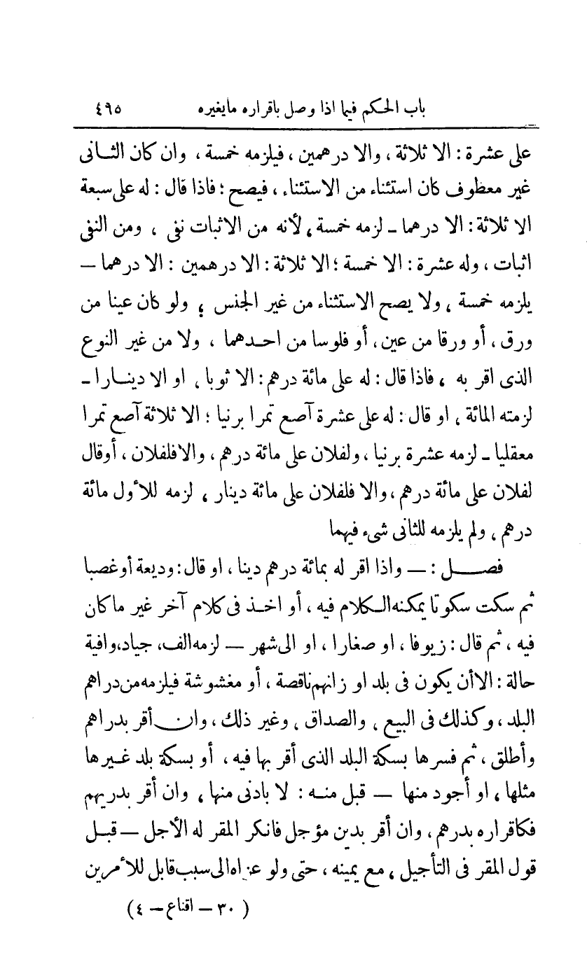 أو أخذ في كلام آخر غير ما كان فيه ثم قال: زيوفا أو صغارا أو إلى شهر - لزمه ألف جياد وافية حالة: إلا أن يكون في بلد أو زانهم ناقصة أو مغشوشة فيلزمه من دراهم البلد وكذلك في البيع والصداق وغير ذلك وإن أقر بدراهم وأطلق ثم فسرها بسكة البلد الذي أقر بها فيه أو بسكة بلد غيرها مثلها أو أجود منها - قبل منه: لا بادني منها وإن أقر بدريهم فكإقراره بدرهم وإن أقر بدبين مؤجل فأنكر المقر له الأجل - قبل قول المقر في التأجيل مع يمينه حتى ولو عزاه إلى سبب قابل للأمرين