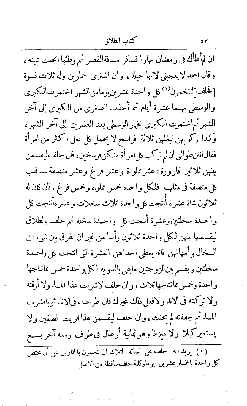 إن لم أطأك في رمضان نهارا فسافر مسافة القصر ثم وطئها انحلت يمينه وقال أحمد لا يعجبني لأنها حيلة وإن اشترى خمارين وله ثلاث نسوة "فحلف" لتتخمرن1 كل واحدة عشرين يوما من الشهر اختمرت الكبرى والوسطى بهما عشرة أيام ثم أخذت الصغرى من الكبرى إلى آخر الشهر ثم اختمرت الكبرى بخمار الوسطى بعد العشرين إلى آخر الشهر وكذا ركوبهن لبغلهن ثلاثة فراسخ لا يحمل كل بغل أكثر من امرأة فقال أنتن طوالق إن لم تركب كل امرأة منكن فرسخين فإن حلف ليقسمن بينهن ثلاثين قارورة: عشر مملوءة وعشر فرغ وعشر منصفة - قلب كل منصفة في مثلها فلكل واحدة خمس مملوءة وخمس فرغ فإن كان له ثلاثون شاة عشرة أنتجت كل واحدة ثلاث سخلات وعشرة أنتجت كل واحدة سخلتين وعشرة أنتجت كل واحدة سخلة ثم حلف بالطلاق ليقسمنها بينهن لكل واحدة ثلاثون رأسا من غير أن يفرق بين شيء من السخال وأمهاتهن فإنه يعطي إحداهن العشرة التي أنتجت كل واحدة سخلتين ويقسم بين الزوجتين ما بقي بالسوية لكل واحدة خمس مما نتاجها واحدة وخمس مما نتاجها ثلاث وإن حلف لا شربت هذا الماء ولا أرقته ولا تركته في الإناء ول فعل ذلك غيرك فإن طرحت في الإناء ثوبا فشرب الماء ثم جففته لم يحنث وإن حلف ليقسمن هذا الزيت نصفين ولا يستعبر كيلا ولا ميزانا وهو ثمانية أرطال في ظرف ومعه آخر يسع