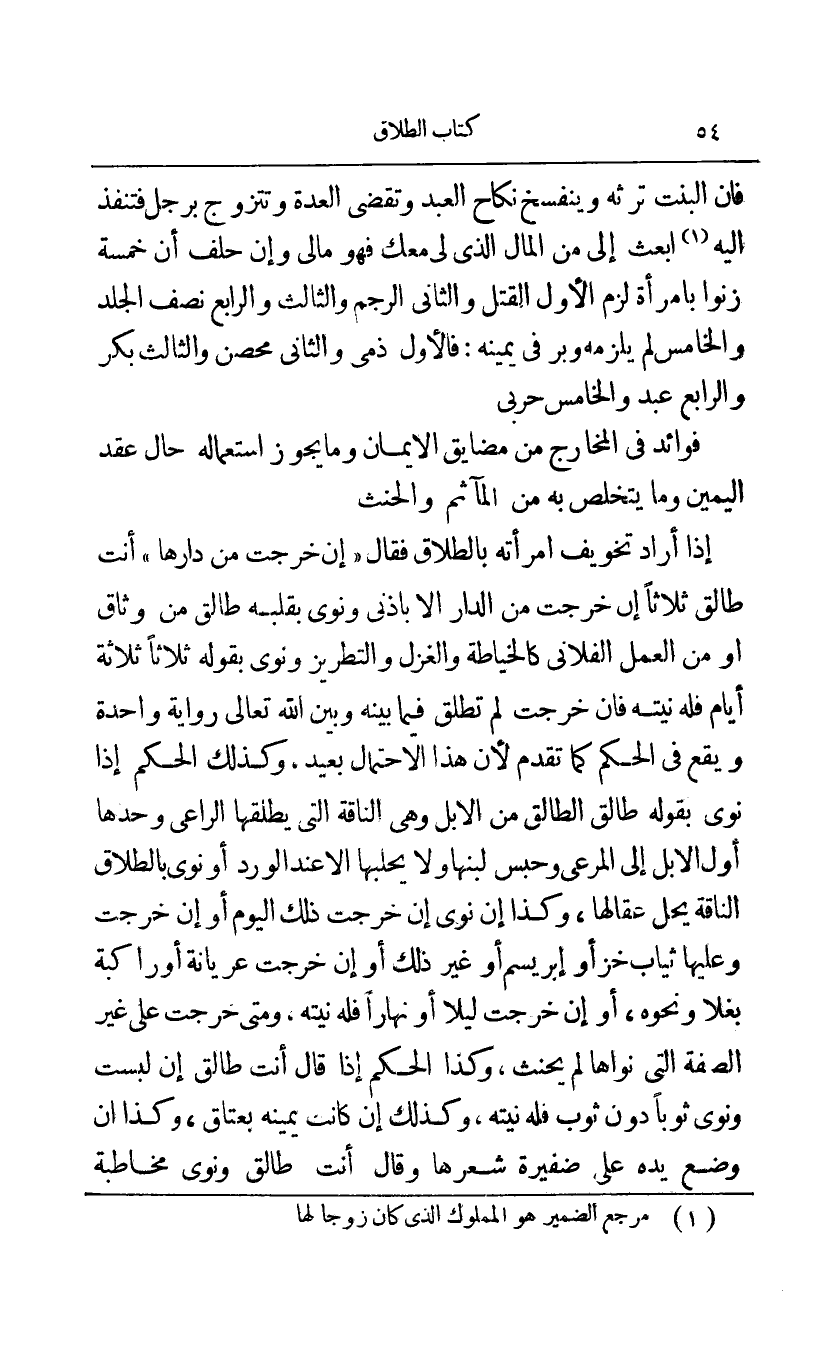 إذا أراد تخويف امرأته بالطلاق فقال: "إن خرجت من دارها" أنت طالق ثلاثا إن خرجت من الدار إلا بإذني ونوى بقلبه طالق من وثاق أو من العمل الفلاني كالخياطة والغزل والتطريز ونوى بقوله ثلاثا ثلاثة أيام فله نيته فإن خرجت لم تطلق فيما بينه وبين الله تعالى رواية واحدة ويقع في الحكم كما تقدم لأن هذا الاحتمال بعيد وكذلك الحكم إذا نوى بقوله طالق الطالق من الإبل وهي الناقة التي يطلقها الراعي وحدها أول الإبل إلى المرعى وحبس لبنها ولا يحلبها إلا عند الورد أو نوى بالطلاق الناقة يحل عقالها وكذا إن نوى إن خرجت ذلك اليوم أو إن خرجت وعليها ثياب خز أو إبريسم أو غير ذلك أو إن خرجت عريانة أو راكبة بغل ونحوه أو إن خرجت ليلا أو نهارا فله نيته ومتى خرجت على غير الصفة التي نواها لم يحنث وكذا الحكم إذا قال أنت طالق إن لبست ونوى ثوبا دون ثوب فله نيته وكذلك إن كانت يمينه بعتاق وكذا إن وضع يده على ضفيرة شعرها وقال أنت طالق ونوى مخاطبة