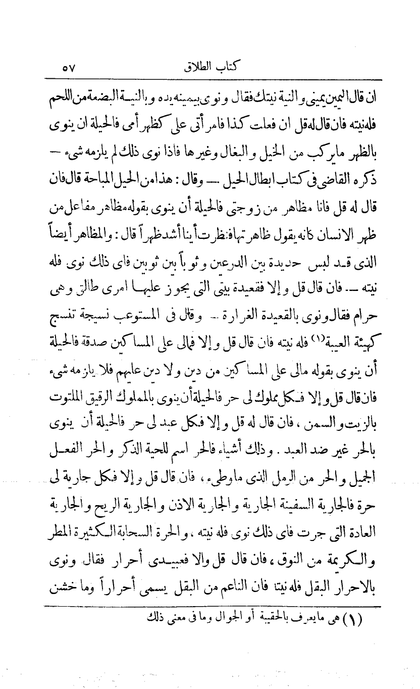 إن قال اليمين يميني والنية نيتك فقال ونوى بيمينه يده وبالنية البضعة من اللحم فله نيته فإن قال له قل إن فعلت كذا فامرأتي علي كظهر أمي فالحيلة أن ينوي بالظهر ما يركب من الخيل والبغال وغيرها فإذا نوى ذلك لم يلزمه شيء - ذكره القاضي في كتاب أبطال الحيل - وقال: هذا من الحيل المباحة قال فإن قال له قل فأنا مظاهر من زوجتي فالحيلة أن ينوي بقوله مظاهر مفاعل من ظهر الإنسان كأنه يقول ظاهرتها فنظرت أينا أشد ظهرا قال: والمظاهر أيضا الذي قد لبس حديدة من الدرعين وثوبا بن ثوبين فأي ذلك ينوى فله نيته - فإن قال قل وإلا فقعيدة بيتي التي يجوز عليها أمري طالق وهي حرام فقال ونوى بالقعيدة الغرارة - وقال في المستوعب نسيجة تنسج كهيئة العيبة1 فله نيته فإن قال قل وإلا فمالي على المساكين صدقة فالحيلة أن ينوي بقوله مالي على المساكين من دين ولا دين عليهم فلا يلزمه شيء فإن قال قل وإلا فكل مملوك لي حر فلا حيلة أن ينوي بالمملوك الرقيق الملتوت بالزيت والسمن فإن قال له قل وإلا فكل عبد لي حر فالحيلة أن ينوي بالحر غير ضد العبد وذلك أشياء فالحر اسم للحية الذكر والحر الفعل الجميل والحر من الرمل الذي ما وطئ فإن قال قل وإلا فكل جارية لي حرة فالجارية السفينة الجارية والجارية الأذن والجارية الريح والجارية العادة التي جرت فأي ذلك نوى فله نيته والحرة السحابة الكثيرة المطر والكريمة من النوق فإن قال قل وإلا فعبيدي أحرار فقال ونوى بالأحرار البقل فله نيته فإن الناعم من البقل يسمى أحرارا وما خشن