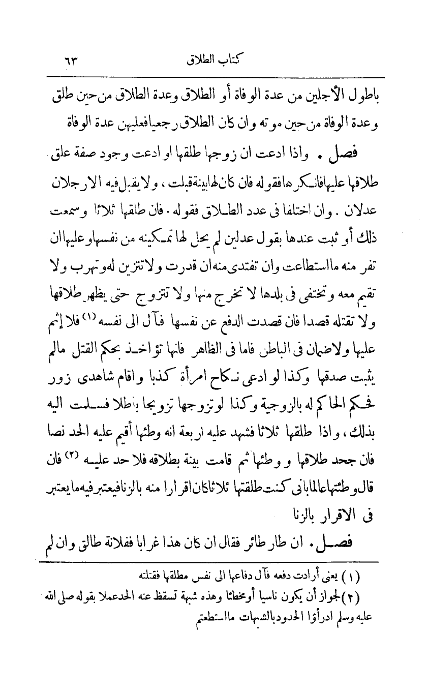 فصل. وإذا ادعت أن زوجها طلقها أو ادعت وجود صفة علق طلاقها عليها فأنكرها فقوله فإن كان لها بينة قبلت ولا يقبل فيه إلا رجلان عدلان وإن اختلفا في عدد الطلاق فقوله فإن طلقها ثلاثا وسمعت ذلك أو ثبت عندها بقول عدلين لم يحل لها تمكينه من نفسها وعليها إن تفر منه ما استطاعت وإن تفتدي منه إن قدرت ولا تتزين له وتهرب ولا تقيم معه وتختفي في بلدها لا تخرج منها ولا تتزوج حتى يظهر طلاقها ولا تقتله قصدا فإن قصدت الدفع عن نفسها فآل إلى نفسه1 فلا إثم عليا ولا ضمان في الباطن فأما في الظاهر فإنها تؤاخذ بحكم القتل ما لم يثبت صدقها وكذا لو ادعى نكاح امرأة كذبا لو تزوجها تزويجا باطلا فسلمت إليه بذلك وإذا طلقها ثلاثا فشهد عليه أربعة أنه وطئها أقيم عليه الحد نصا فإن جحد طلاقها ووطئها ثم قامت بينة بطلاقه فلا حد عليه2 فإن قال وطئتها عالما بأني كنت طلقتها ثلاثا كان إقرارا منه بالزنا فيعتبر فيه ما يعتبر في الإقرار بالزنا.