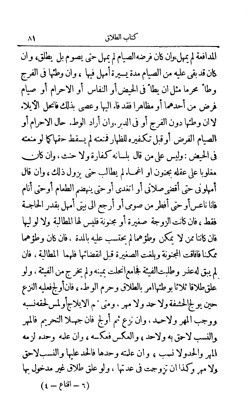 المدافعة لم يمهل وإن كان فرضه الصيام لم يمهل حتى يصوم بل يطلق وإن كان قد بقي عليه من الصيام مدة يسيرة أمهل فيها وإن وطئها في الفرج وطأ محرما مثل أن يطأ في الحيض أو النفاس أو الإحرام أو صيام فرض من أحدهما أو مظاهرا فقد فاء إليها وعصى بذلك فانحل الإيلاء لا إن وطئها دون الفرج أو في الدبر وإن أراد الوطء حال الإحرام أو الصيام الفرض أو قبل تكفيره للظهار فمتعته لم يسقط حقها كما لو منعته في الحيض: وليس على ما قال بلسانه كفارة ولا حنث وإن كان مغلوبا على عقله بجنون أو إغماء لم يطالب حتى يزول ذلك وإن قال أمهلوني حتى أقضي صلاتي أو أتغدى أو حتى ينهضم الطعام أو حتى أنام فأنا ناعس أو حتى أفطر من صومي أو أرجع إلى بيتي أمهل بقدر الحاجة فقط فإن كانت الزوجة صغيرة أو مجنونة فليس لها المطالبة ولا لوليها فإن كانتا ممن لا يمكن وطؤهما لم يحتسب عليه بالمدة فإن كان وطؤهما ممكنا فأفاقت المجنونة وبلغت الصغيرة قبل انقضائها فلهما المطالبة فإن لم يبق له عذر وطلبت الفيئة فجامع انحلت يمينه ولم يخرج من الفيئة ولو علق طلاقا ثلاثا بوطئها أمر بالطلاق وحرم الوطء فإن أولج فعليه النزع حين يولج الحشفة ولا حد ولا مهر ومتى تم الإيلاج أو لمس حقه نسبه ووجب المهر ولا حد وإن نزع ثم أولج فإن جهلا التحريم فالمهر والنسب لاحق به ولا حد والعكس فعكسه وإن علمه وحده لزمه المهر والحد ولا نسب وإن علمته وحدها فالحد عليها والنسب لاحق ولا مهر وكذا إن تزوجت في عدتها ولو علق طلاق غير مدخول بها