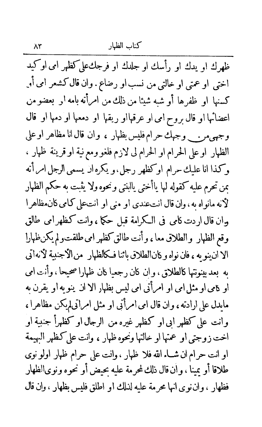 ظهرك أو يدك أو رأسك أو جلدك أو فرجك علي كظهر أمي أو كيد أختي أو عمتي أو خالتي من نسب أو رضاع وإن قال كشعر أمي أو كسنها أو ظفرها أو شبة شيئا من ذلك من امرأته بأمه أو بعضو من أعضائها أو قال بروح أمي أو عرقها أو ريقها أو دمعها أو دمها أو قال وجهي من وجهك حرام فليس بظهار وإن قال أنا مظاهر أو علي الظهار أو على الحرام أو الحرام لي لازم فلغو ومع نية أو قرينة ظهار وكذا أنا عليك حرام أو كظهر رجل ويكره أن يسمى الرجل امرأته بمن تحرم عليه كقوله لها يا أختي يا ابنتي ونحوه ولا يثبت به حكم الظهار لأنه ما نواه به، وإن قال أنت عندي أو منى أو أنت علي كأمي كان مظاهرا وإن قال أردت كأمي في الكرامة قبل حكما وأنت كظهر أمي طالق وقع الظهار والطلاق معا وأنت طالق كظهر أمي طلقت ولم يكن ظهارا إلا أن ينويه فإن نواه وكان الطلاق بائنا فكالظهار من الأجنبية لأنه أتى به بعد بينونتها كالطلاق وإن كان رجعيا كان ظهارا صحيحا وأنت أمي أو كأمي أو مثل أمي أو امرأتي أمي ليس بظهار إلا أن ينويه أو يقرن به ما يدل على إرادته وإن قال أمي امرأتي أو مثل امرأتي لم يكن مظاهرا وأنت علي كظهر أبي أو كظهر غيره من الرجل أو كظهر أجنبية أو أخت زوجتي أو عمتها أو خالتها ونحوه ظهار وأنت علي كظهر البهيمة أو أنت حرام إن شاء الله فلا ظهار وأنت علي حرام ظهار أو لو نوى طلاقا أو يمينا وإن قال ذلك لمحرمة عليه بحيض أو نحوه ونوى الظهار فظهار وإن نوى أنها محرمة عليه لذلك أو أطلق فليس بظهار، وإن قال