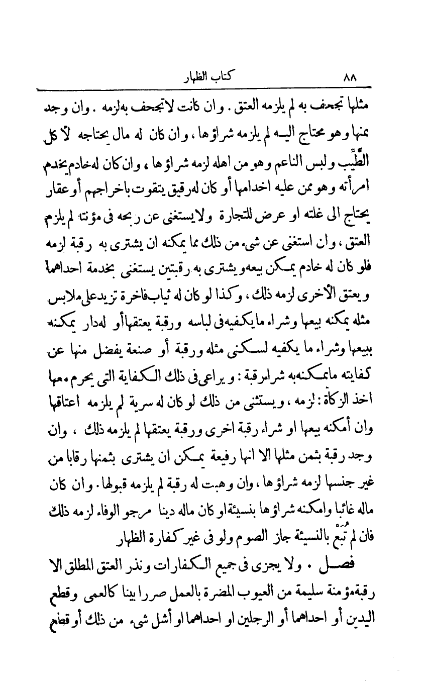 مثلها تجحف به لمط يلزمه العتق وإن كانت لا تجحف به لزمه وإن وجد يمينها وهو محتاج إليه لم يلزمه شراؤها وإن كان له مال يحتاجه لأكل الطيب ولبس الناعم وهو من أهله لزمه شراؤها وإن كان له خادم يخدم امرأته وهو ممن عليه إخدامها أو كان له رقيق يتقوت بإخراجهم أو عقار يحتاج إلى غلته أو عرض للتجارة ولا يستغني عن ربحه في مؤنته لم يلزم العتق وإن استغنى عن شيء من ذلك مما يمكنه أن يشتري به رقبة لزمه فلو كان له خادم يمكن بيعه ويشتري به رقبتين يستغني بخدمة أحدهما ويعتق الأخرى لزمه ذلك وكذا لو كان له ثياب فاخرة تزيد على ملابس مثله يمكنه بيعها وشراء ما يكفيه في لباسه ورقبة يعتقها أو له دار يمكنه بيعها وشراء ما يكفيه لسكنى مثله ورقبة أو صنعة يفضل منها عن كفايته ما يمكنه به شراء رقبة: ويراعى في ذلك الكفاية التي حرم معها أخذ الزكاة: لزمه ويستثنى من ذلك لو كان له سرية لم يلزمه إعتاقها وإن أمكنه بيعها أو شراء رقبة أخرى ورقبة يعتقها لم يلزمه ذلك وإن وجد رقبة بثمن مثلها إلا أنها رفيعة يمكن أن يشتري بثمنها رقابا من غير جنسها لزمه شراؤها وإن وهبت له رقبة لم يلزمه قبولها وإن كان ماله غائبا وأمكنه شراؤها بنسيئة أو كان ماله دينا مرجو الوفاء لزمه ذلك فإن لم تبع بالنسيئة جاز الصوم ولو في غير كفارة الظهار.