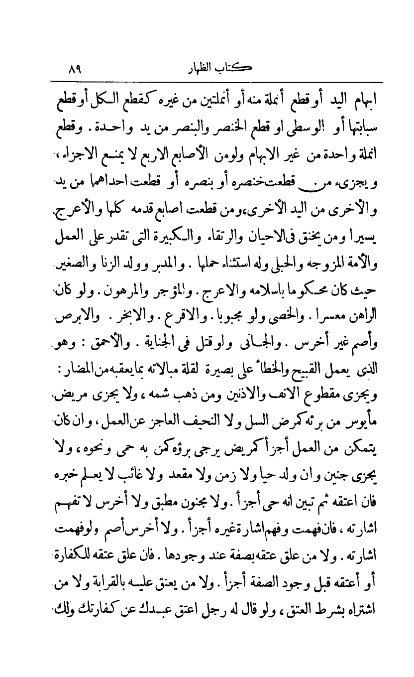 إبهام اليد أو قطع أنملة منه أو أنملتين من غيره كقطع الكل أو قطع سبابتها أو الوسطى أو قطع الخنصر والبنصر من يد واحدة وقطع أنملة واحدة من غير الإبهام ولو من الأصابع الأربع لا يمنع الإجزاء ويجزئ من قطعت خنصره أو بنصره أو قطعت إحداهما من يد والأخرى من اليد الأخرى ومن قطعت أصابع قدمه كلها والأعرج يسيرا ومن يخنق في الأحيان والرتقاء والكبيرة التي تقدر على العمل والأمة المزوجه والحبلى وله استثناء حملها والمدبر وولد الزنا والصغير حيث كان محكوما بإسلامه والأعرج والمؤجر والمرهون ولو كان الراهن معسرا والخصي ولو مجبوبا والأقرع والأبخر والأبرص وأصم غير أخرس والجاني ولو قتل في الجناية والأحمق: وهو الذي يعمل القبيح والخطأ على بصيرة لقلة مبالاته بما يعقبه من المضار: ويجزى مقطوع الأنف والأذنين ومن ذهب شمه ولا يجزي مريض مأيوس من برئه كمرض السل ولا النحيف العاجز عن العمل وإن كان يتمكن من العمل أجزأ كمريض يرجى برؤه كمن به حمى ونحوه ولا يجزى جنين وإن ولد حيا ولا زمن ولا مقعد ولا غائب لا يعلم خبره فإن أعتقه ثم تبين أنه حي أجزأ ولا مجنون مطبق ولا أخرس لا تفهم إشارته فإن فهمت وفهم إشارة غيره أجزأ ولا أخرس أصم ولو فهمت إشارته ولا من علق عتقه بصفة عند وجودها فإن علق عتقه للكفارة أو أعتقه قبل وجود الصفة أجزأ ولا من يعتق عليه بالقرابة ولا من اشتراه بشرطك العتق ولو قال له رجل اعتق عبدك عن كفارتك ولك