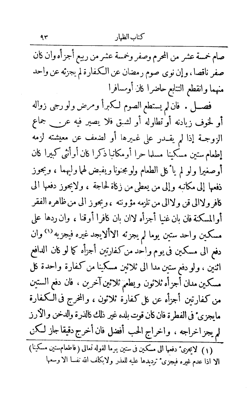 ولو رجي زواله أو لخوف زيادته أو تطاوله أو لشق فلا يصير فيه عن جماع الزوجة إذا لم يقدر على غيرها أو لضعف عن معيشته لزمه إطعام ستين مسكينا مسلما حرا أو مكاتبا ذكرا كان أو أنثى كبيرا كان أو صغيرا ولو لم يأكل الطعام ولو مجنونا ويقبض لهما وليهما ويجوز دفعها إلى مكاتبه وإلى من يعطي من زكاة لحاجة ولا يجوز دفعها إلى كافر ولا إلى قن ولا إلى من تلزمه مؤونته ويجوز إلى من ظاهره الفقر أو المسكنة فإن بان غنيا أجزأه لا إن بان كافرا أو قنا وإن ردها على مسكين واحد ستين يوما لم يجزئه إلا ألا يجد غيره فيجزيه1 وإن دفع إلى مسكين في يوم واحد من كفارتين أجزأه كما لو كان الدافع اثنين ولو دفع ستين مدا إلى ثلاثين مسكينا من كفارة واحدة كل مسكين مدان أجزأه ثلاثون ويطعم ثلاثين آخرين فإن دفع الستين من كفارتين أجزأه عن كل كفارة ثلاثون والمخرج في الكفارة ما يجزئ في الفطرة فإن كان قوت بلده غير ذلك كالذرة والدخن والأرز لم يجز إخراجه وإخراج الحب أفضل فإن أخرج دقيقا جاز لكن