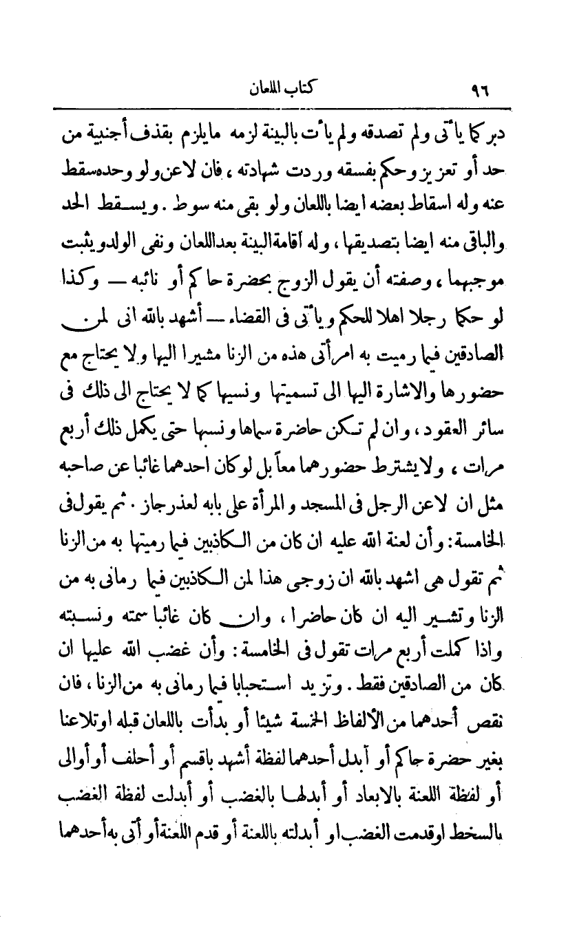 دبر كما يأتي ولم تصدقه ولم يأت بالبينة لزمه ما يلزم بقذف أجنبية من حد أو تعزيز وحكم بفسقه وردت شهادته فإن لاعن ولو وحده سقط عنه وله إسقاط بعضه أيضا باللعان ولو بقى منه سوط ويسقط الحد والباقي منه أيضا بتصديقها وله إقامة البينة بعد اللعان ونفى الولد ويثبت موجبهما وصفته أن يقول الزوج بحضرة حاكم أو نائبه - وكذا لو حكما رجلا أهلا للحكم ويأتي في القضاء - أشهد بالله أني لمن الصادقين فيما رميت به امرأتي هذه من الزنا مشيرا إليها ولا يحتاج مع حضورها والإشارة إليها إلى تسميتها ونسيها كما لا يحتاج إلى ذلك في سائر العقود وإن لم تكن حاضرة سماها ونسبها حتى يكمل ذلك أربع مرات ولا يشترط حضورهما معا بل لو كان أحدهما غائبا عن صاحبه مثل أن لاعن الرجل في المسجد والمرأة على بابه لعذر جاز ثم يقول في الخامسة: وأن لعنة الله عليه إن كان من الكاذبين فيما رميتها به من الزنا ثم تقول هي أشهد بالله أن زوجي هذا لمن الكاذبين فيما رماني به من الزنا وتشير إليه إن كان حاضرا وإن كان غائبا سمته ونسبته وإذا كملت أربع مرات تقول في الخامسة: وأن غضب الله عليها إن كان من الصادقين فقط وتزيد استحبابا فيما رماني به من الزنا فإن نقص أحدهما من الألفاظ الخمسة شيئا أو بدأت باللعان قبله أو تلاعنا بغير حضرة حاكم أو أبدل أحدهما لفظة أشهد بأقسم أو أحلف أو أوالي أو لفظة اللعنة بالإبعاد أو أبدلها بالغضب أو أبدلت لفظة الغضب بالسخط أو قدمت الغضب أو بدلته باللعنة أو قدم اللعنة أو أتى به أحدهما