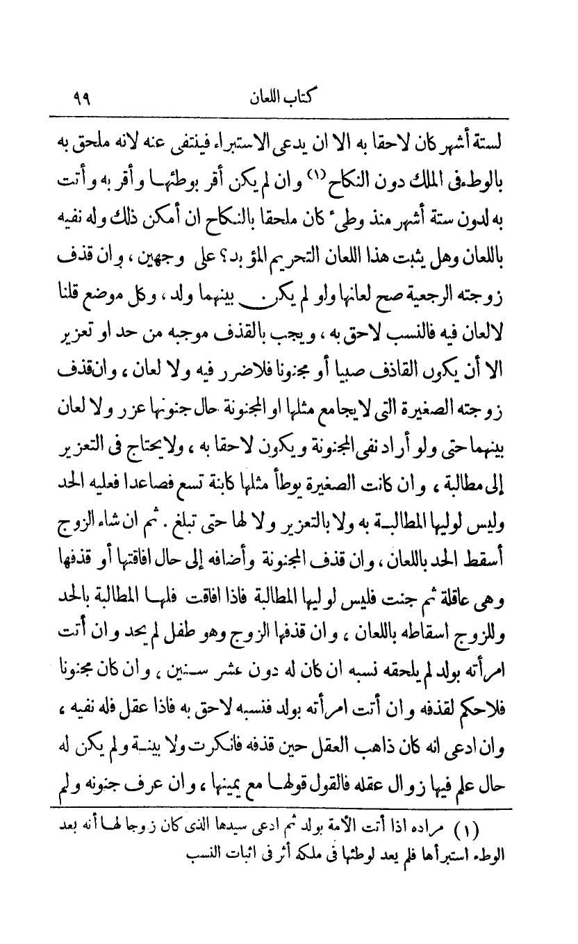لستة أشهر كان لاحقا به إلا أن يدعي الاستبراء فينتفي عنه لأنه محلق به بالوطء في الملك دون النكاح1 وإن لم يكن أقر بوطئها وأقر به وأتت به لدون ستة أشهر منذ وطئ كان ملحقا بالنكاح إن أمكن ذلك وله نفيه باللعان وهل يثبت هذا اللعان التحريم المؤبد؟ على وجهين وإن قذف زوجته الرجعية صح لعانها ولو لم يكن بينهما ولد وكل موضع قلنا لا لعان فيه فالنسب لا حق به ويجب بالقذف موجبه من حد أو تعزير إلا أن يكون القاذف صبيا أو مجنونا فلا ضرر فيه ولا لعان وإن قذف زوجته الصغيرة التي لا يجامع مثلها أو المجنونة حال جنونها عزر ولا لعان بينهما حتى ولو أراد نفي المجنونة ويكون لاحقا به ولا يحتاج في التعزير إلى مطالبة وإن كانت الصغيرة يوطأ مثلها كإبنة تسع فصاعدا فعليه الحد وليس لوليها المطالبة به ولا بالتعزير ولا لها حتى تبلغ ثم إن شاء الزوج أسقط الحد باللعان وإن قذف المجنونة وأضافه إلى حال إفاقتها أو قذفها وهي عاقلة ثم جنت فليس لوليها المطالبة فإذا أفاقت فلها المطالبة بالحد وللزوج إسقاطه باللعان وإن قذفها الزوج وهو طفل لم يحد وإن أتت امرأته بولد لم يلحقه نسبه إن كان له دون عشر سنين وإن كان مجنونا فلا حكم لقذفه وإن أتت امرأته بولد فنسبه لا حق به فإذا عقل فله نفيه وإن ادعى أنه كان ذاهب العقل حين قذفه فأنكرت ولا بينة ولم يكن له حال علم فيها زوال عقله فالقول قولها مع يمينها وإن عرف جنونه ولم