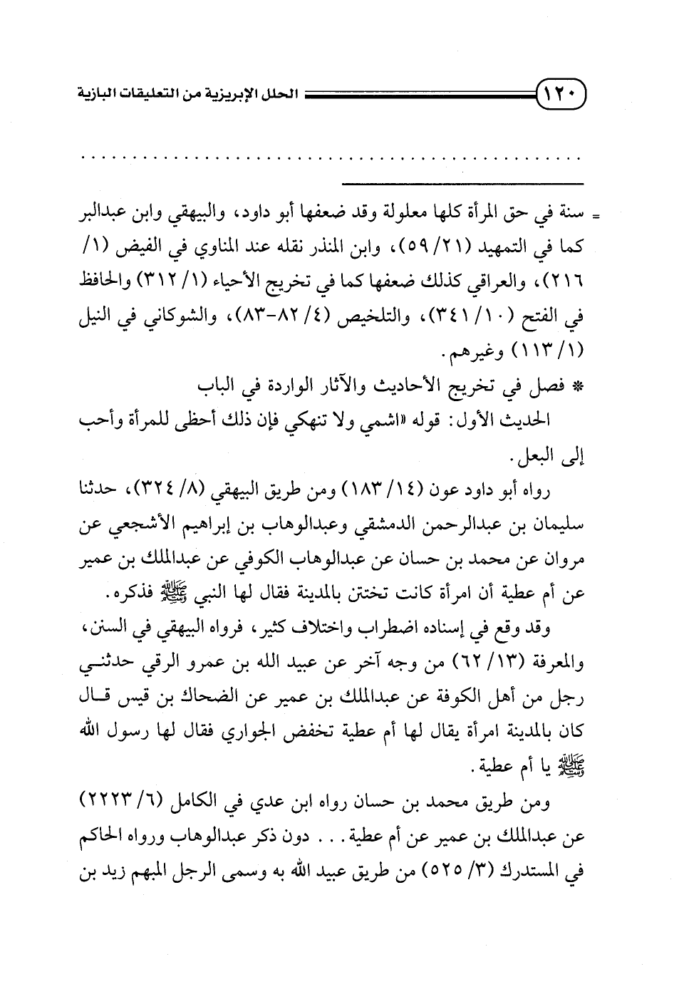 = سنة في حق المرأة كلها معلولة وقد ضعفها أبو داود، والبيهقي وابن عبد البر كما في التمهيد (21/ 59) , وابن المنذر نقله عند المناوي في الفيض (1/ 216)، والعراقي كذلك ضعفها كما في تخريج الأحياء (1/ 312) والحافظ في الفتح (10/ 341)، والتلخيص (4/ 82 - 83)، والشوكاني في النيل (1/ 113) وغيرهم.